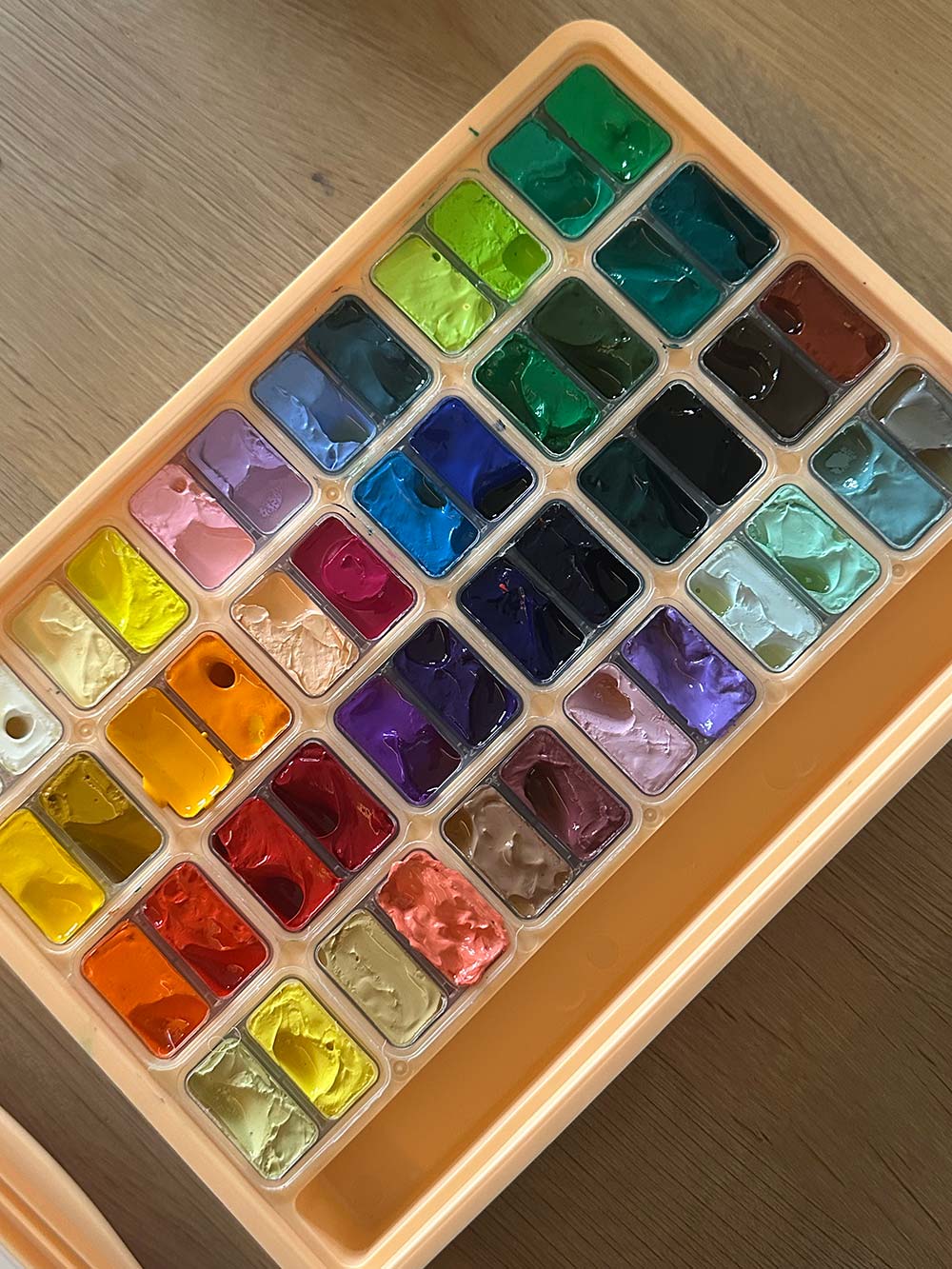 Van Nicky kreeg ik voor mijn verjaardag dit HIMI Gouache palette en ik maakte hem dit weekend eindelijk open om ermee te gaan schilderen. Kijk al die kleuren, zo heerlijk.