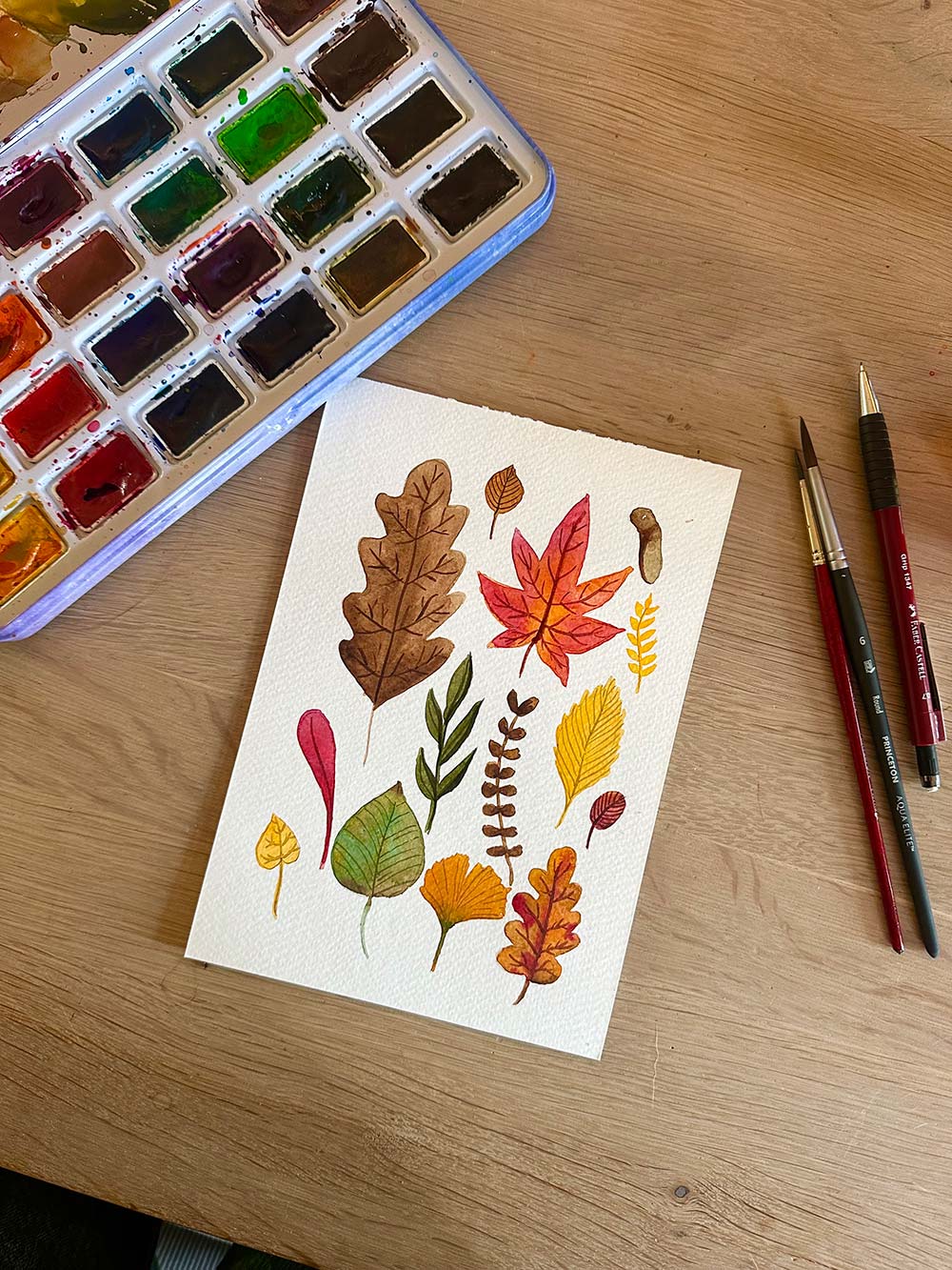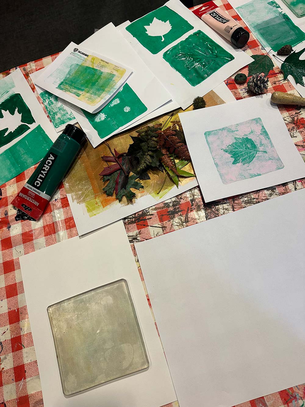 Het is heel leuk: met zo’n gelliplate kan je afdrukken maken in combinatie met acrylverf, en wij gebruikten natuurlijke materialen zoals blaadjes en andere dingen uit het bos. Het is leuk om met de kleuren en laagjes te experimenteren!