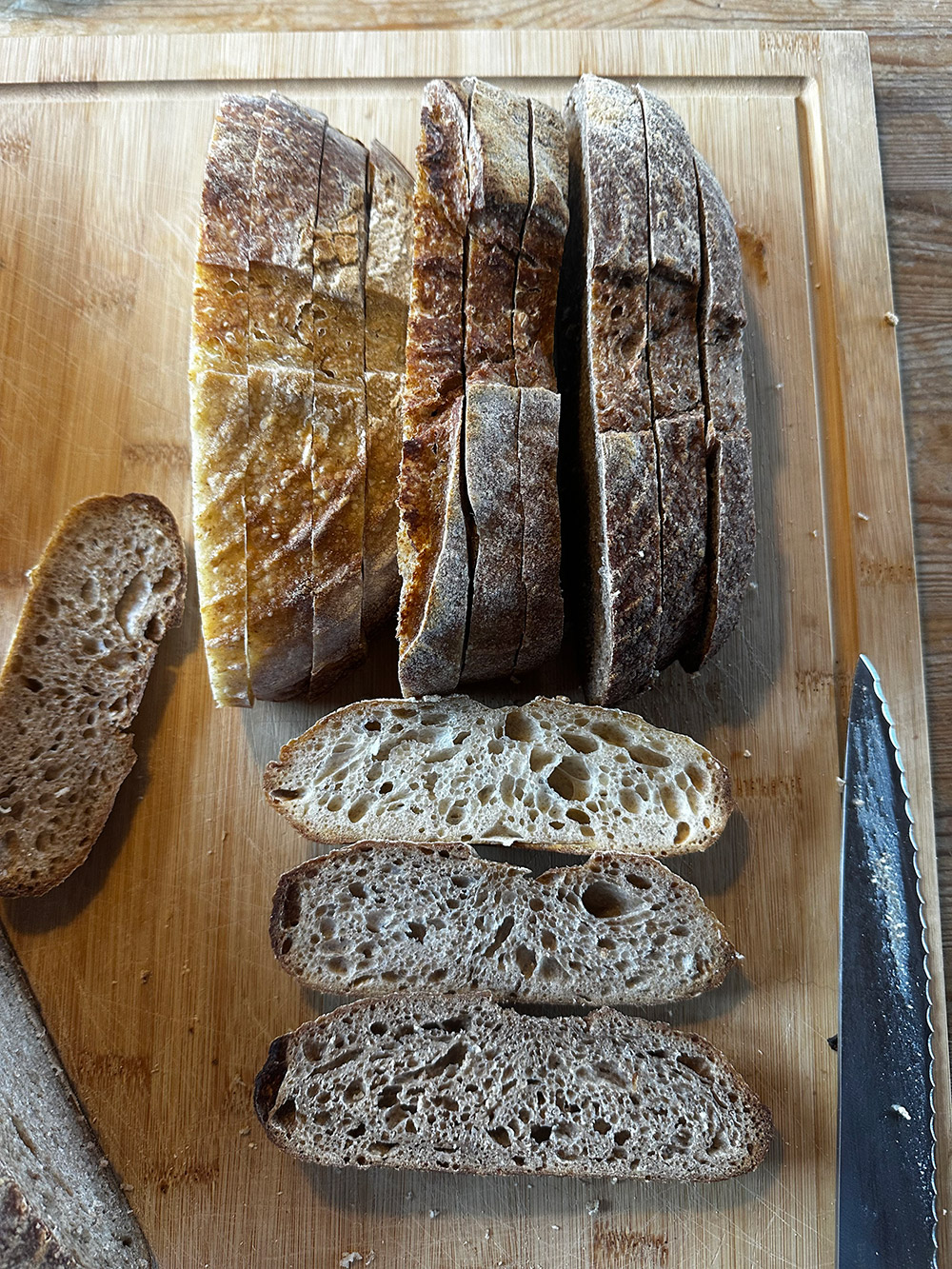 HEt zijn niet mijn mooiste broden ooit (ik weet waarom: het deeg heeft te lang na de bulkrijs in de koelkast gestaan), gelukkig is de smaak heel goed. Tenminste, dat ontdek ik als we op Terschelling zijn.