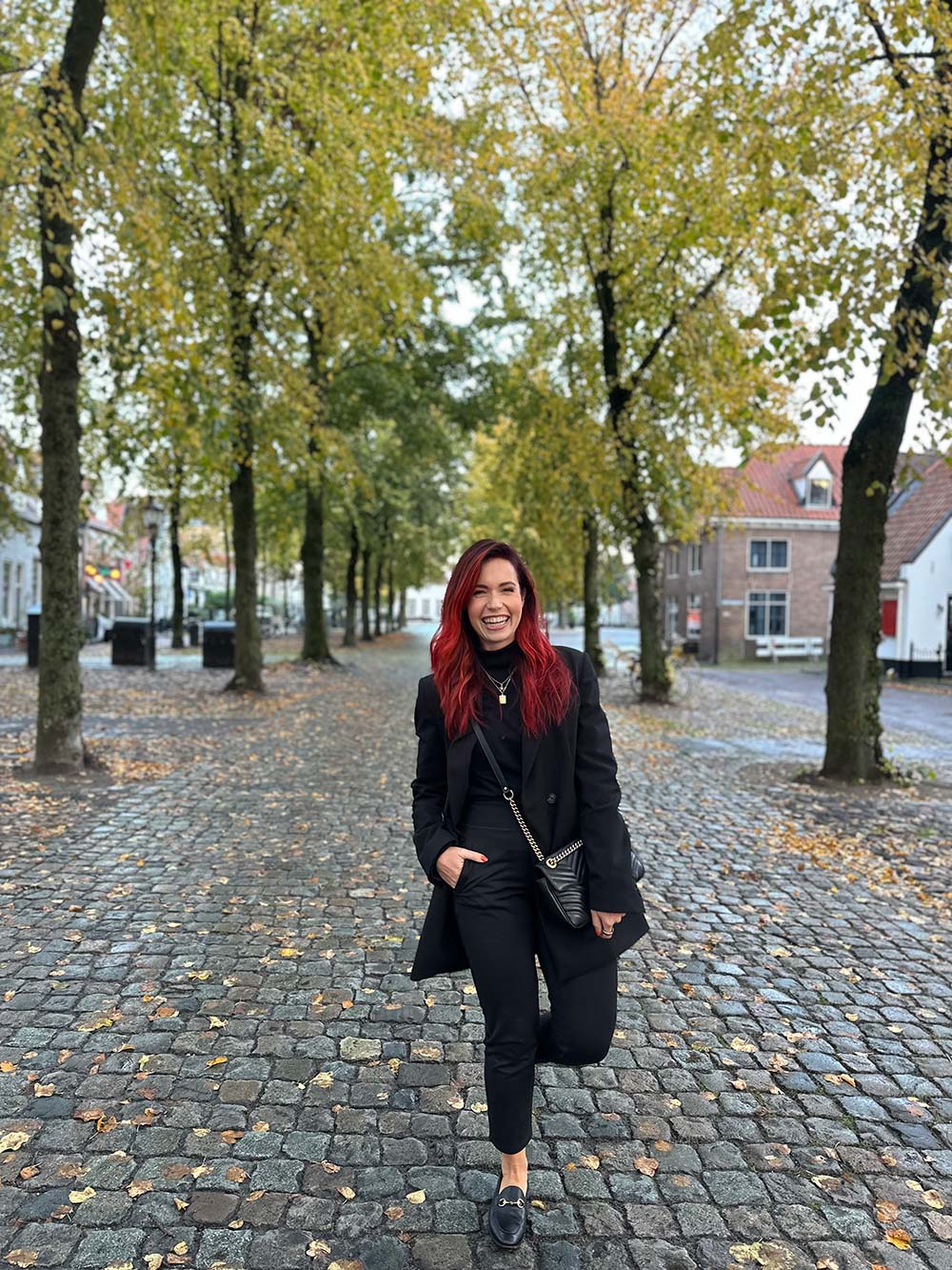 In Harderwijk. Ik draag hier een Ninepine broek, Gucci tas en schoenen en een Selected blazer.