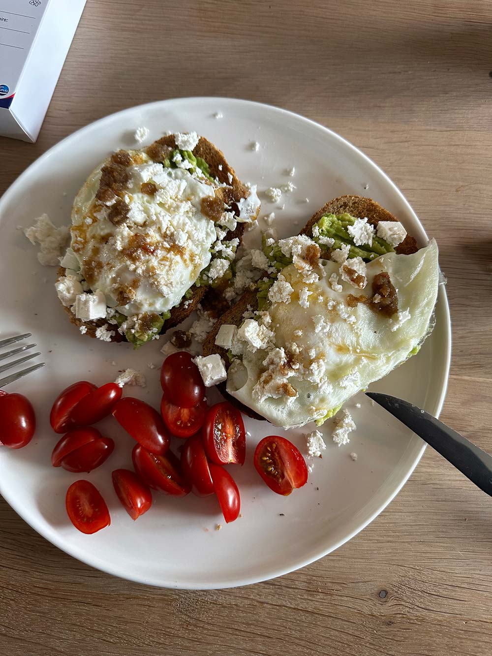 Lunchen met toast met avocado, ei, feta en hete saus.