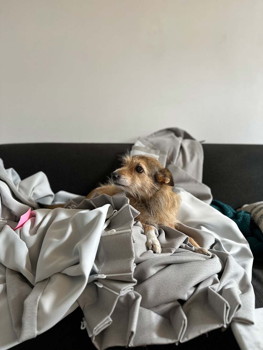Kees gaat lekker op de gordijnen liggen. Topplek.