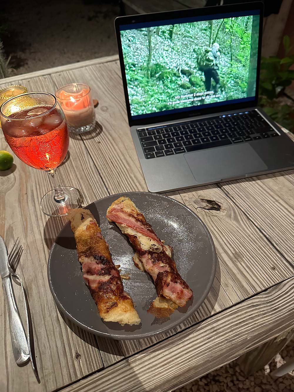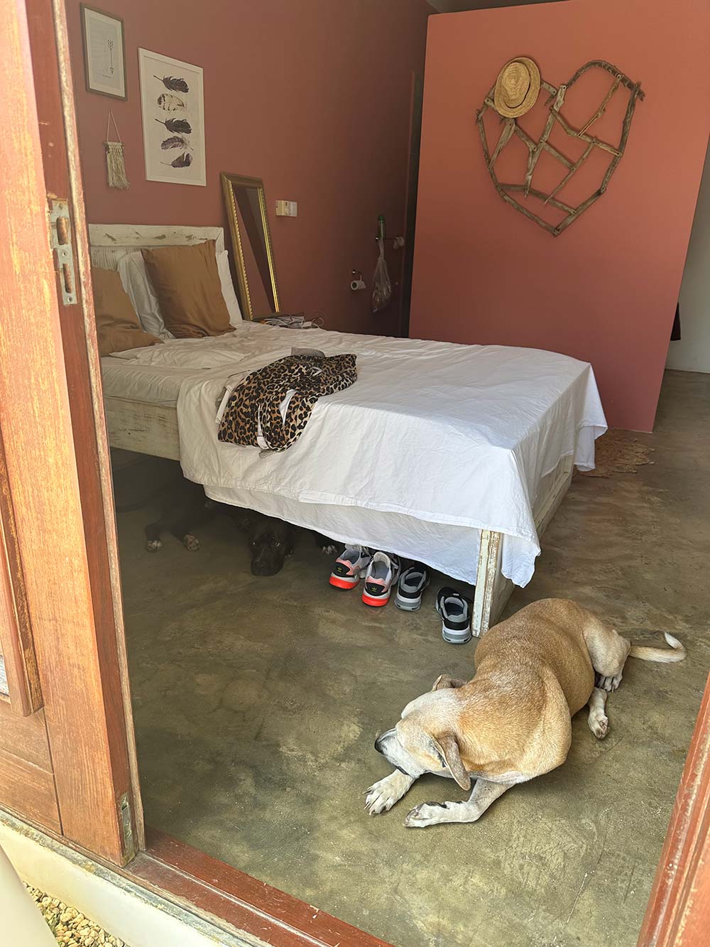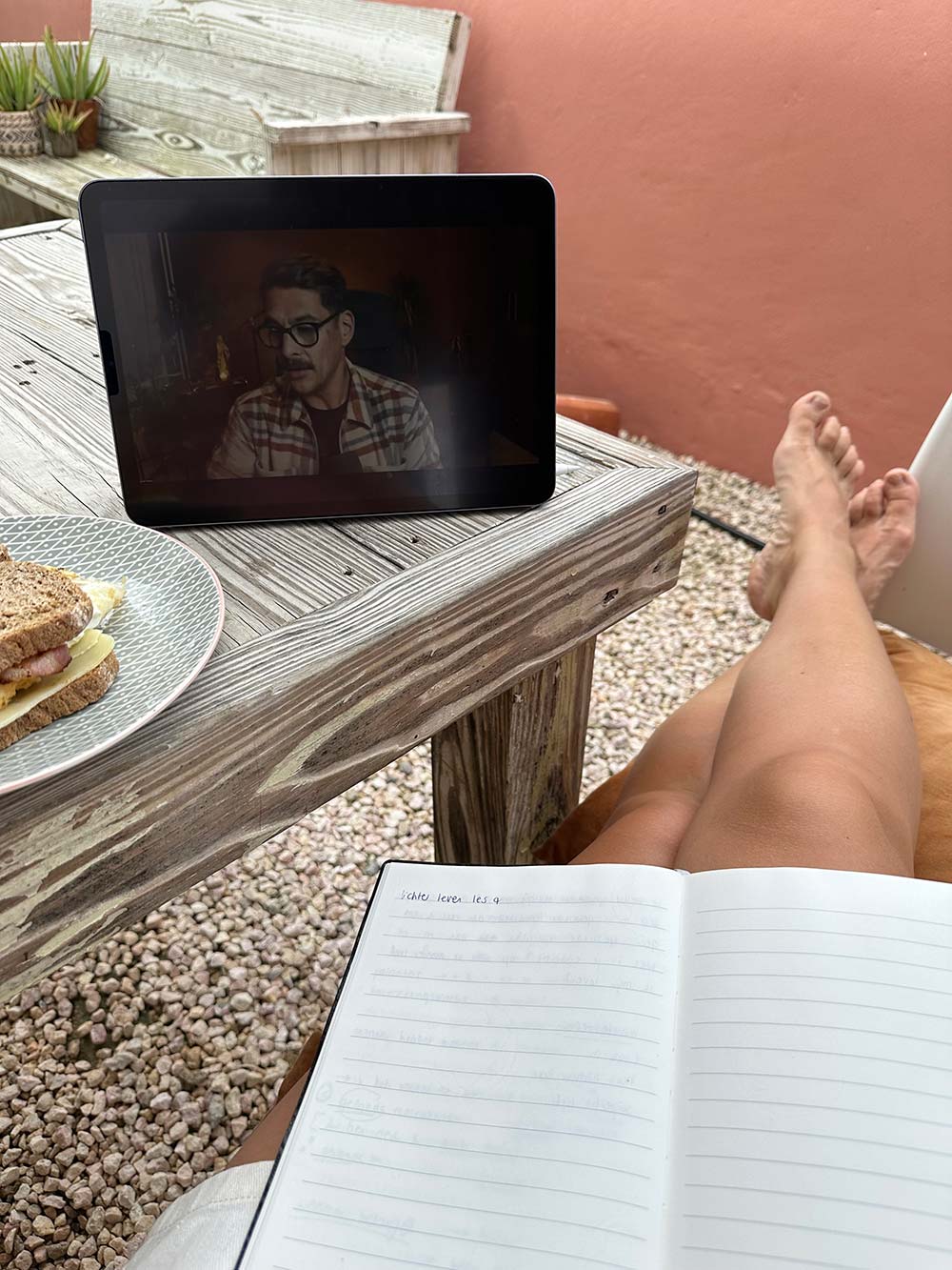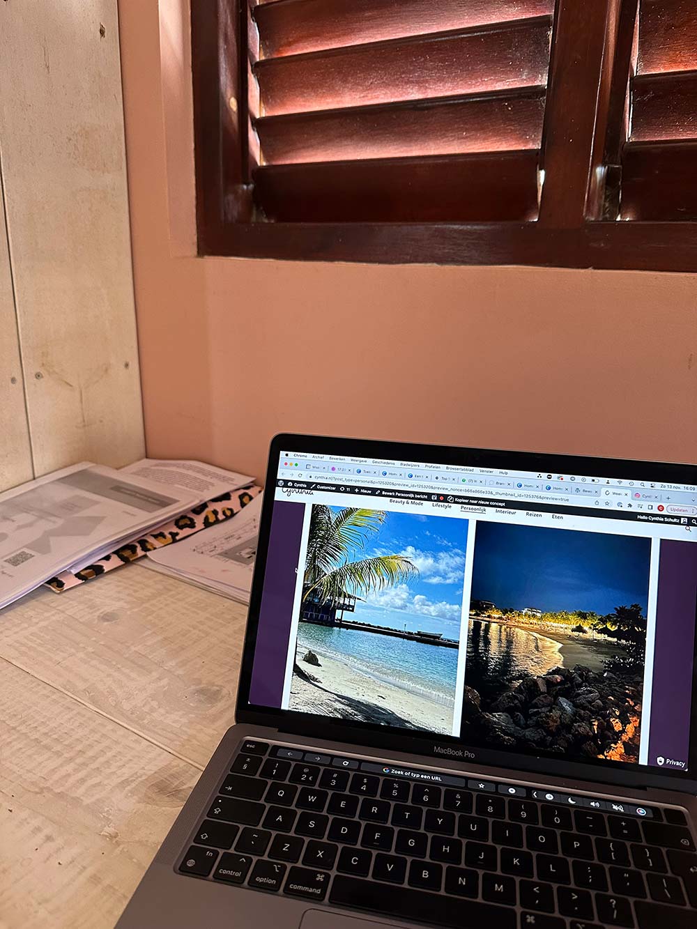 Hahah, één werkfoto. Elke ochtend zit ik er zo bij. Dit is even op het kantoor bij Joia en Max thuis (ik verblijf in hun studio aan hun huis vast), even in de airco en met snelle wifi. Maar ik werk ook veel in m’n tuintje of zoals nu vanuit bed, haha.