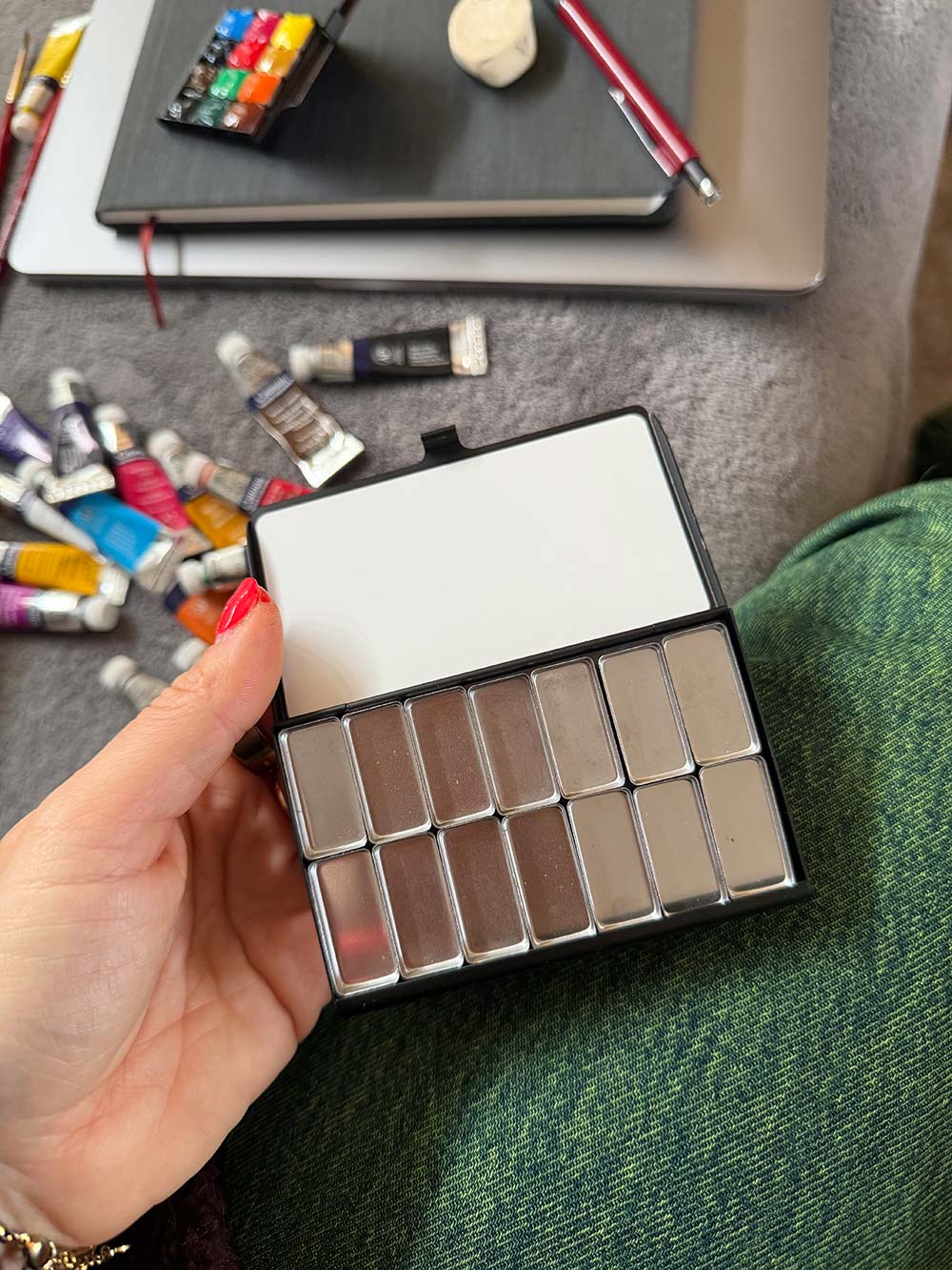 Die Art Toolkit paletjes koop je leeg en vul je zelf met waterverf uit tubes. Ik heb tubes van Winsor & Newton. Dit grotere paletje heb ik nieuw en neem ik ook mee naar Bali, zo heb ik veel keus en veel verf in toch een heel compact setje.