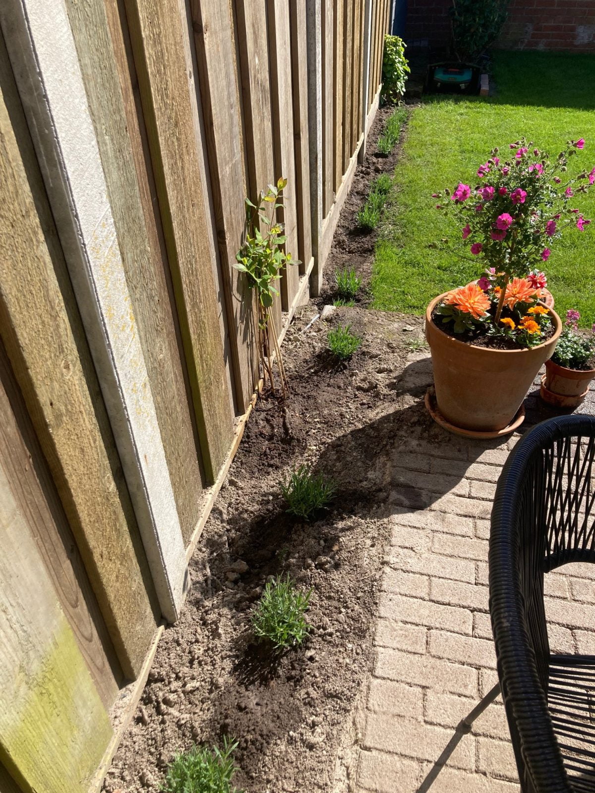 Aan de schuttingzijde hebben we allemaal lavendel gepoot met ook daartussen allemaal klimmers. Er komen daar nog wat klimrozen bij.