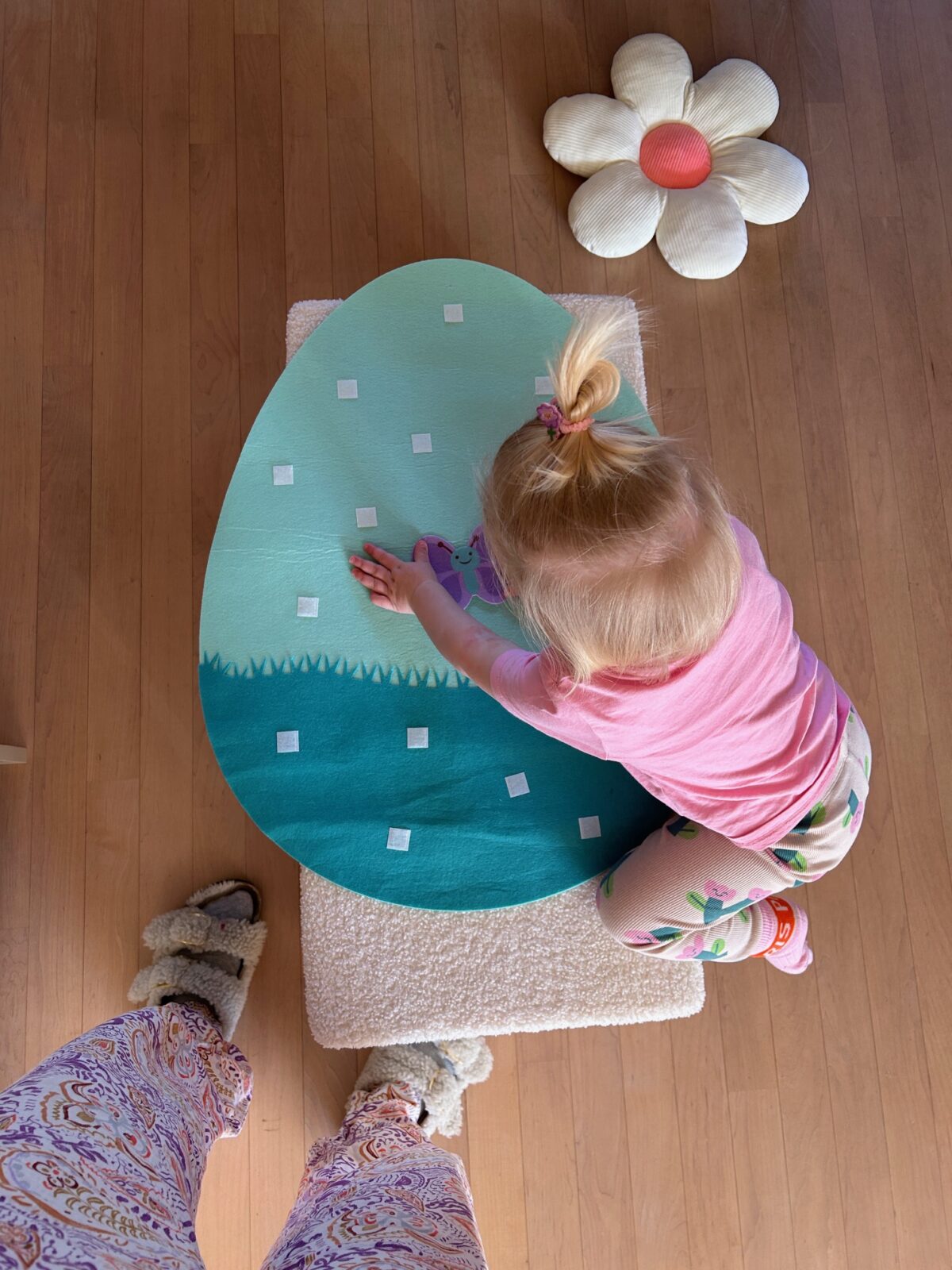 En vilten deco plakken op dit giga Paasei met klittenband.