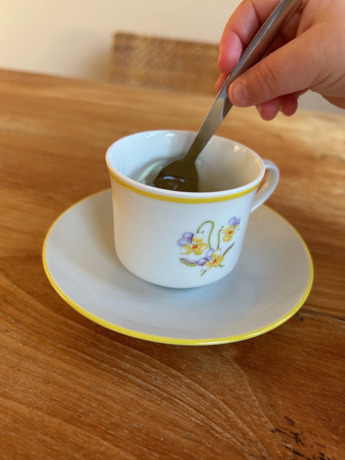 Op woensdag ben ik altijd vrij met Novae, mijn mama-dag. We gingen naar tante Diana in Duitsland, en gingen ook even samen naar de kringloop waar ik dit schattige espressokopje kocht voor Novae. Ik kocht er ook gelijk zes ontbijtbordjes van, ik vond het zo’n lief motief! Ik had behoorlijk wat ontbijtbordjes met een hapje eraf hier en daar. Weg ermee.