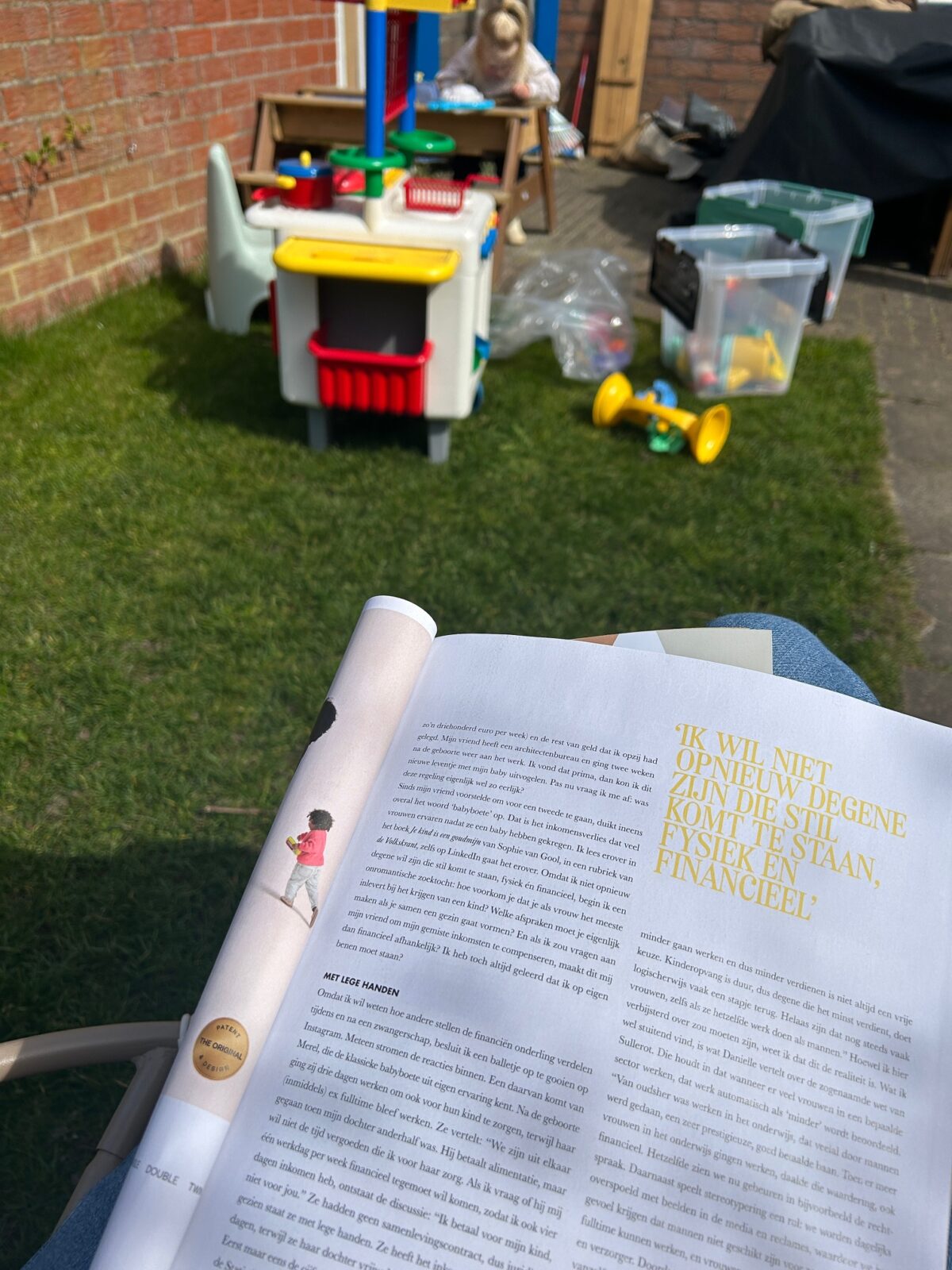 Op mijn vrije dag met Novae is het lekker weer dus ik zet het plastic speelkeukentje buiten neer voor Novae. Samen met haar zandtafel maakt dat ze enorm leuk zelfstandig aan het spelen gaat. Ik kan zowaar een paar bladzijdes lezen uit de Linda Mini! Onze tuin is nog niet voorjaars-klaar. Luuk heeft met z’n vader samen een super mooie pergola gebouwd en daardoor staat overal nog een beetje wat. We gaan ook nog een bankje bouwen, dus als alles af is dan laat ik wat mooiere foto’s van de tuin zien. Voor nu zet ik mijn stoeltje gewoon neer, waar de zon schijnt.