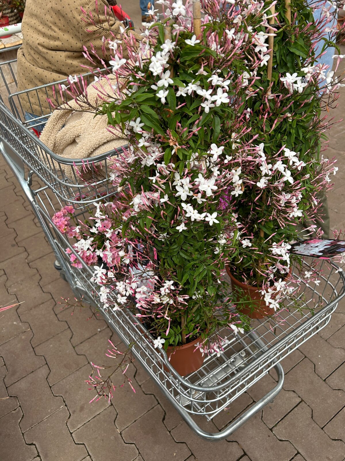 Later dat weekend gingen we het tuincentrum in voor wat klimmers tegen de nieuwe pergola aan. We gingen voor twee mooie Jasmijnplanten. De geur hiervan vind ik ZO lekker!