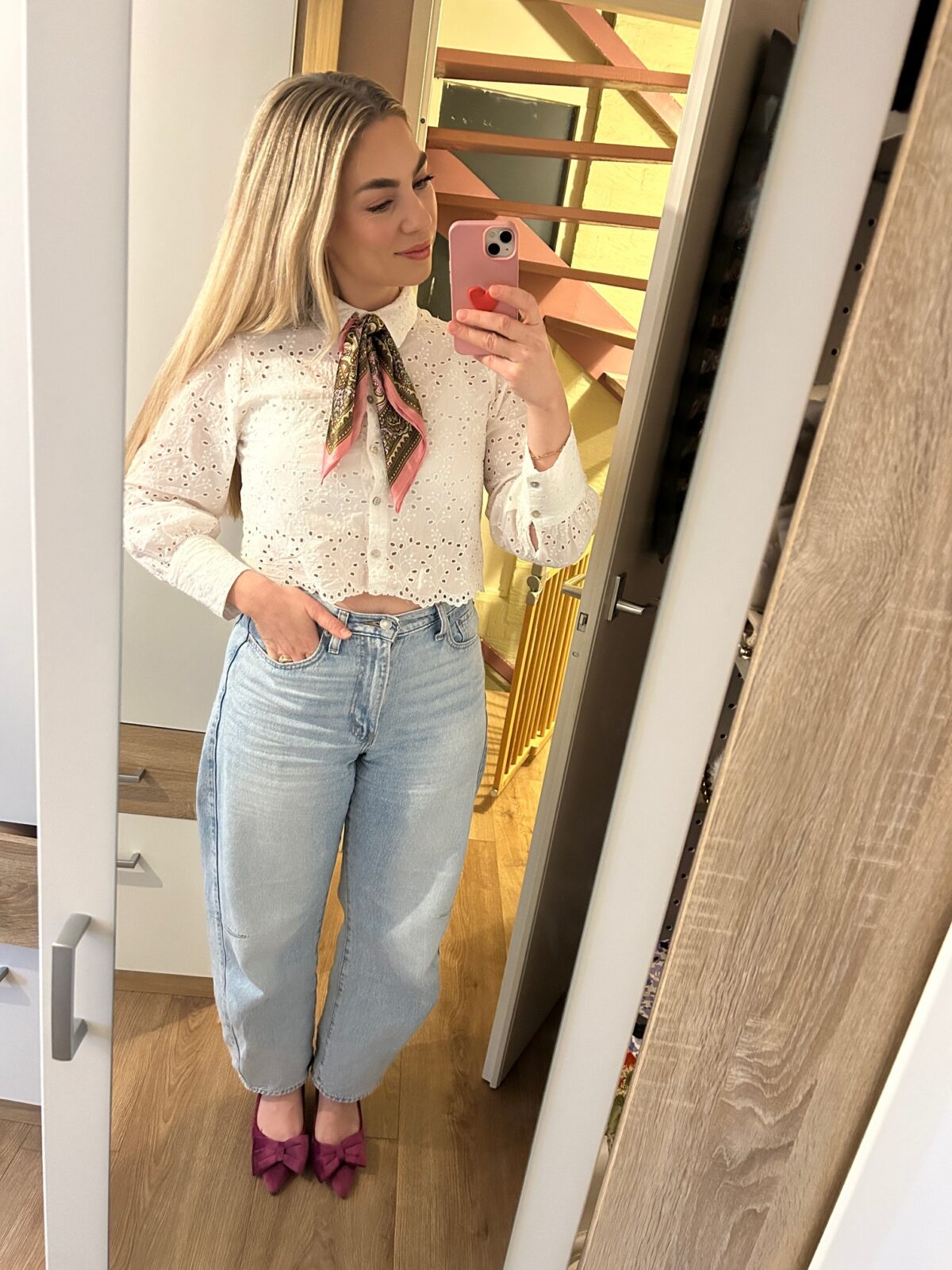 Ik maakte me klaar voor een etentje met vriendinnen en droeg deze fijne barrel jeans van Levi’s. Het is een ‘cinch’ model, wat betekent dat hij knoopjes in de taille heeft om de taille aansluitender te maken (en weer losser te doen na zo’n etentje haha). GENIAAL! Ik heb altijd moeite met gapende taillebanden omdat ik wat rianter ben bedeeld in het heup en bil departement. Ik heb inmiddels de cinch barrel en de cinch baggy.