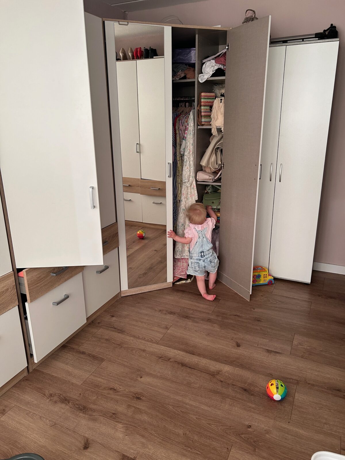 Hier zeg ik dan weer even geen nee, want ik ben me aan het opmaken en dan laat ik haar gewoon al mijn tassen uit de kast trekken die er nu toch al niet netjes in liggen.