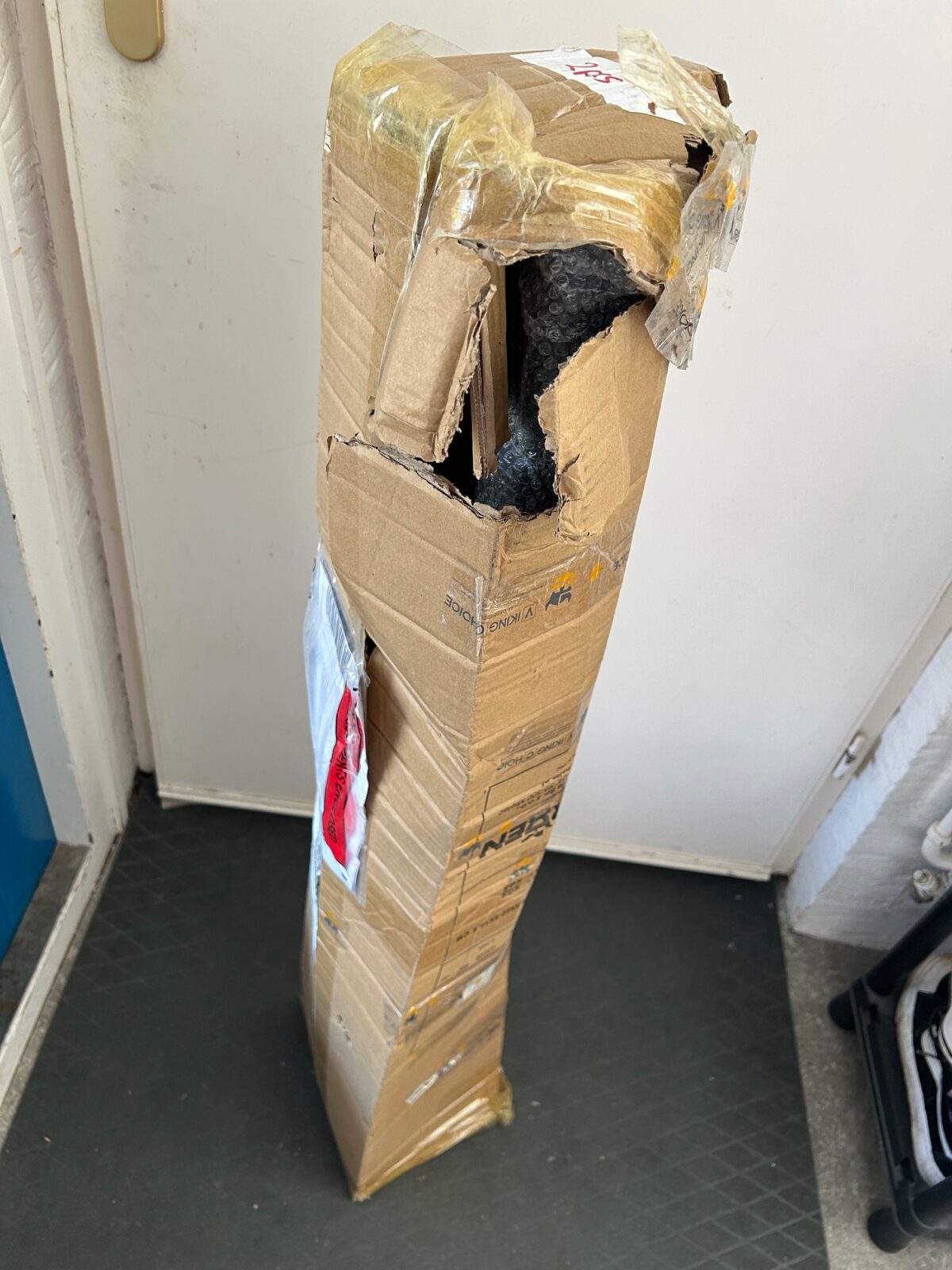 We kregen ook de nieuwe schommel binnen, helaas kwam het zo aan en zaten er ook wel wat krasjes op.