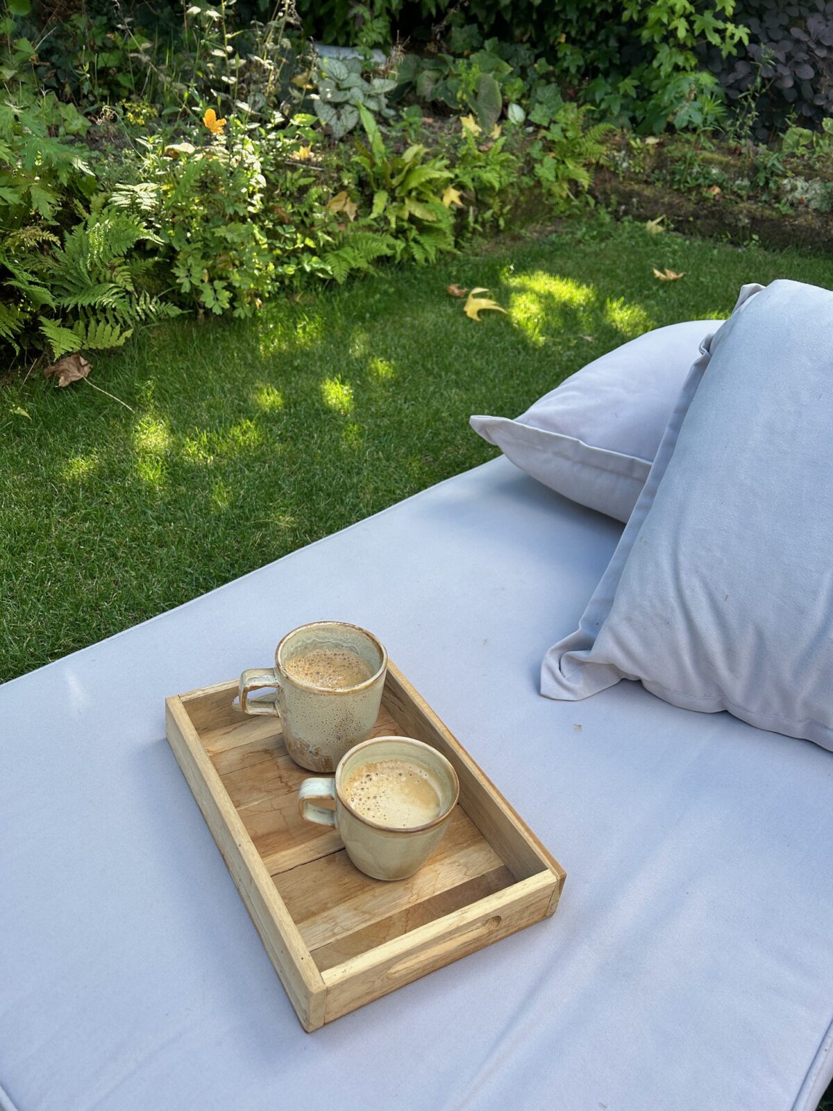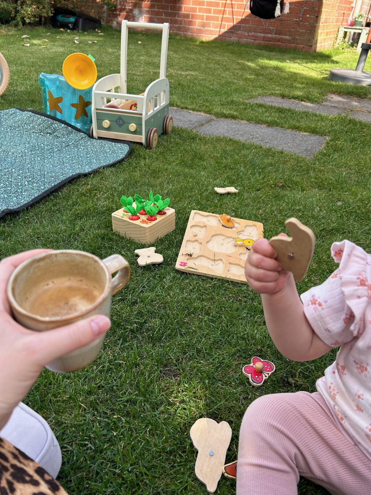 Even een kopje koffie in de tuin in Novae’s dutje, maar die meid wilde niet slapen. Ze slaapt nu nog twee keer, maar er zijn dagen dat ze eigenlijk met één keer af kan. Het verschilt heel erg per dag, waar ze is, hoe lang ze in de ochtend sliep, of ze nog moeheid van dagen ervoor heeft, hoe laat ze wakker was, etc. We moeten er denk ik maar eens mee gaan uittesten om haar ochtenddutje heel kort te maken, of om die cold turkey over te slaan. Heel irritant die overgangen van een dutje eraf vind ik altijd. Als het eenmaal gewend is, vind ik het wel heel chill want hoe minder dutjes hoe meer bewegingsvrijheid.