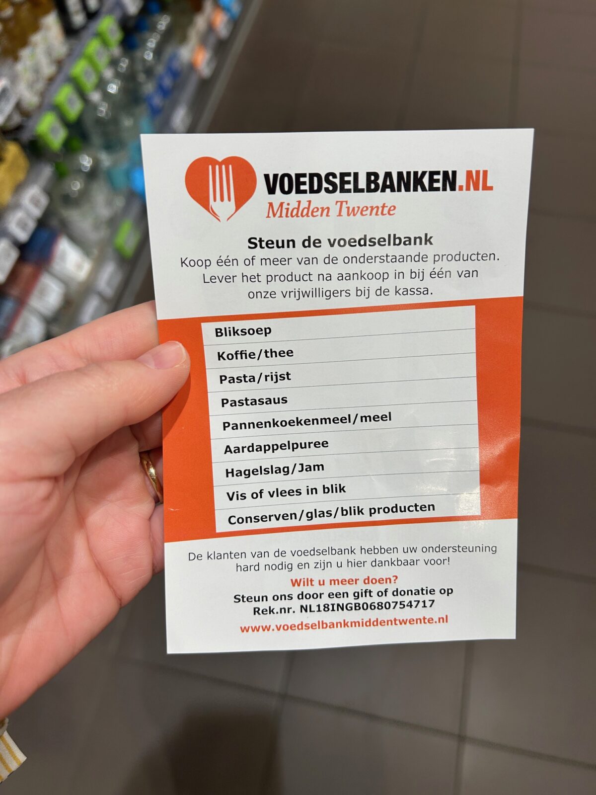 De Albert Heijn waar wij in gingen hielden een actie voor De Voedselbank en vroegen of we iets van dit lijstje konden kopen. Topactie! We kochten van alles wat en zagen dat eigenlijk vrijwel iedereen dat deed. Heel erg mooi! Ik denk dat zo’n actie ook heel tastbaar is voor mensen, in tegenstelling tot geld doneren. Je weet dat zo’n fysiek product echt bij mensen terecht gaat komen.