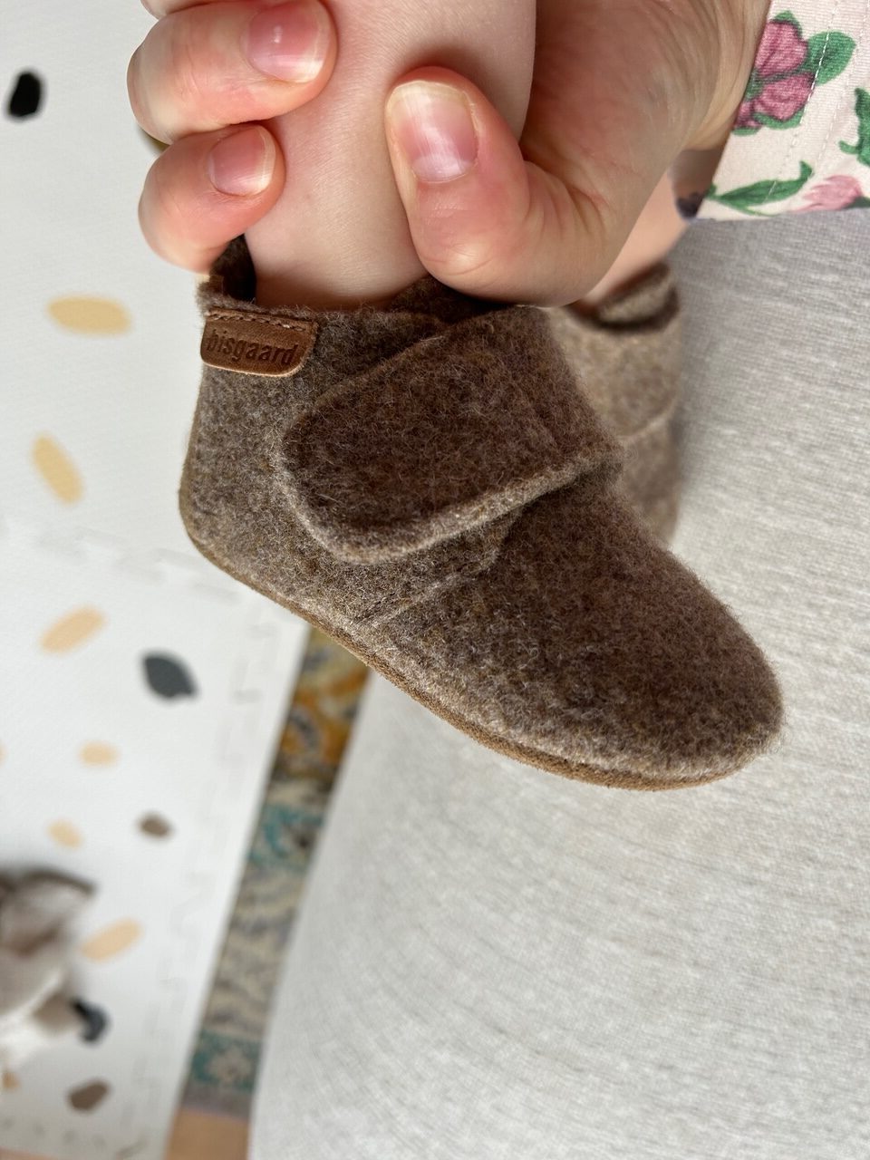 Hahaha dit ziet eruit alsof ik dit beentje echt heel hard vastknijp maar geloof me, er zijn geen kinderen geschaad bij het maken van deze foto. Het gaat om het slofje, van Bisgaard (via Zalando) helemaal van wol. Deze zijn zo lekker warm, en hebben een goed flexibel zooltje voor beginnende stappers. Die gladde sloffen glijdt ze mee uit bij ons op de gladde vloer.