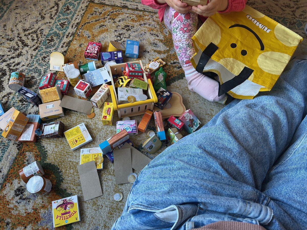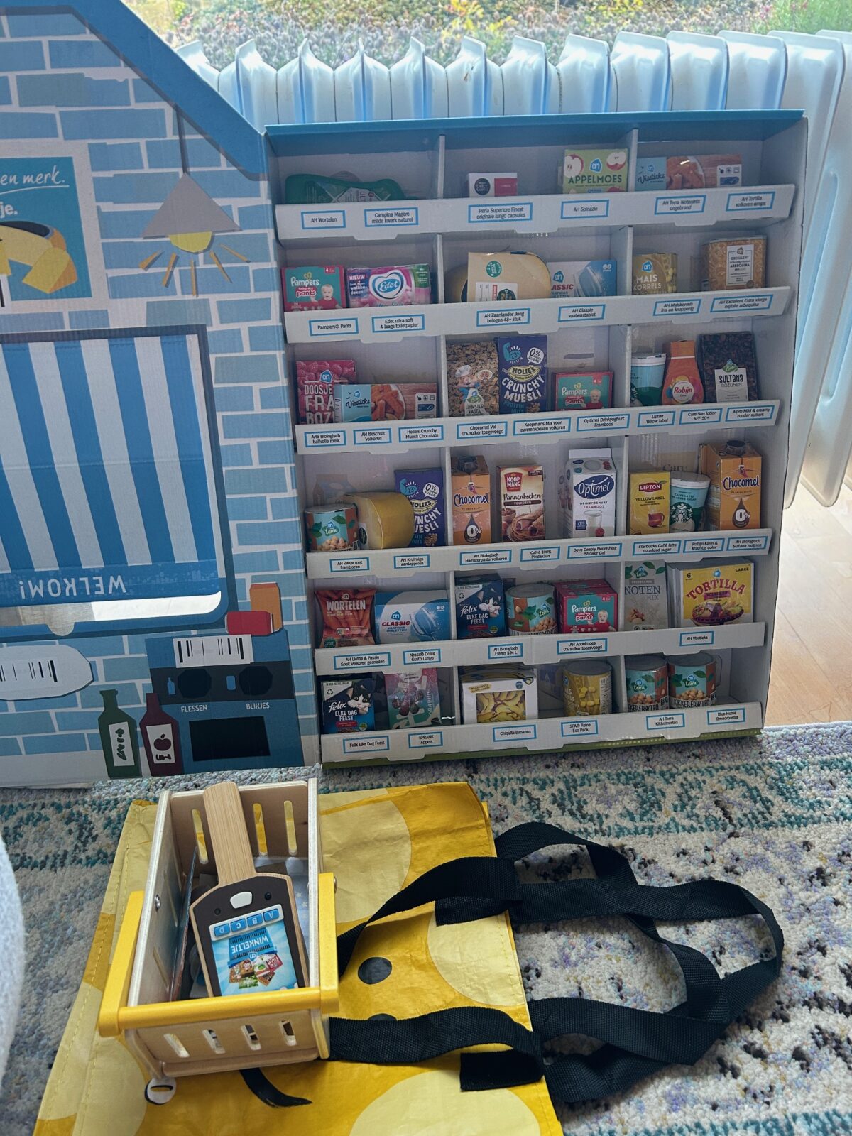 Niet alles past in het winkeltje, en er zitten ook nog wat random dingen bij die we al hadden van ander speelgoed haha.