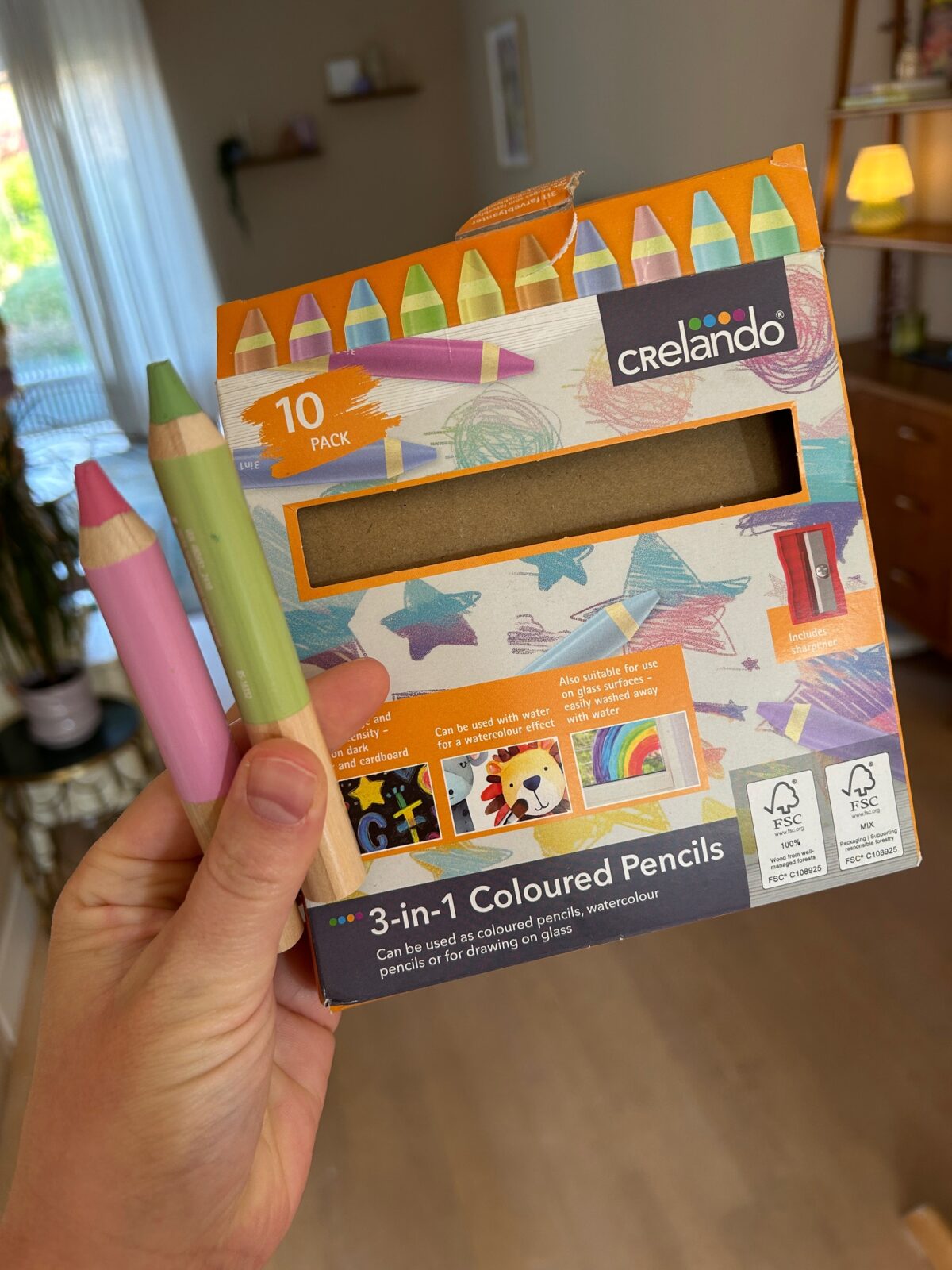 Dit zijn pastelkleurige potloden die je gewoon droog als potlood kan gebruiken, maar ook nat als een soort waterverf én ook op het raam.