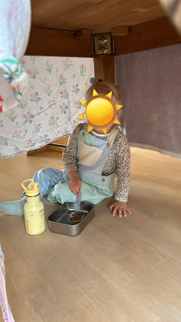 Tot slot groentepannenkoekjes eten in een tentje onder de eettafel. Het is ook haar zondag hè 😛