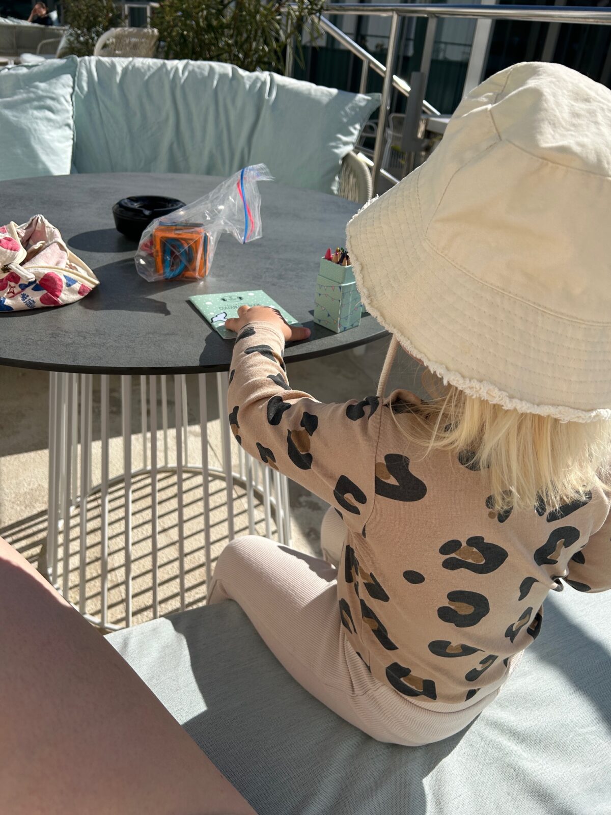 We hebben van allerlei klein speelgoed mee. Een paar magneettegeltjes in een zakje, een klein kleurboekje met potloodjes, een magnetisch aankleed-beertje in een blikje, veel kleine leesboekjes en statische stickers.