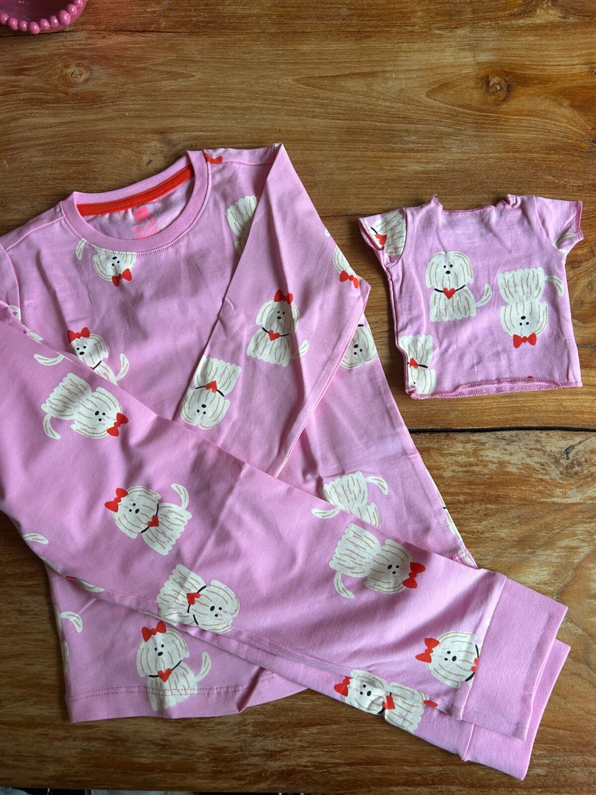 Voor Novae kocht ik deze geinige pyjama bij de Hema, waar ook een shirtje voor de knuffel of pop bij zat. Te cute! Novae vond het eerst heel leuk maar toen ze ging slapen moest hij toch uit bij Ko (haar konijn).