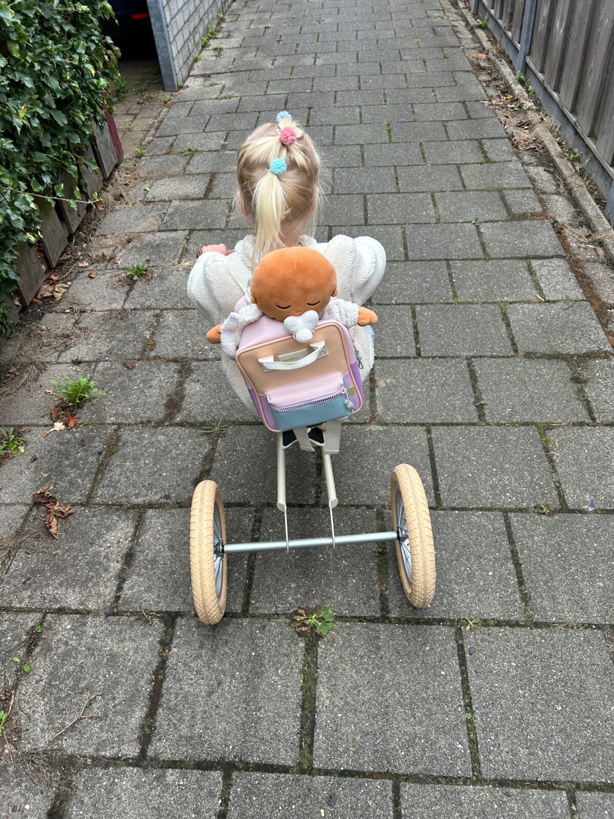 Ze weet nog niet dat ze een poppenzitje voor op haar fietsje krijgt van Sinterklaas, dus nu moet Guusje nog even zo mee.