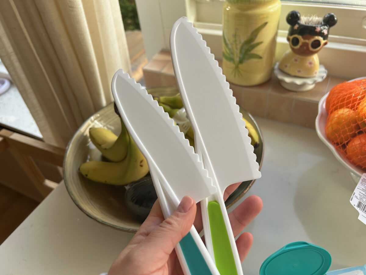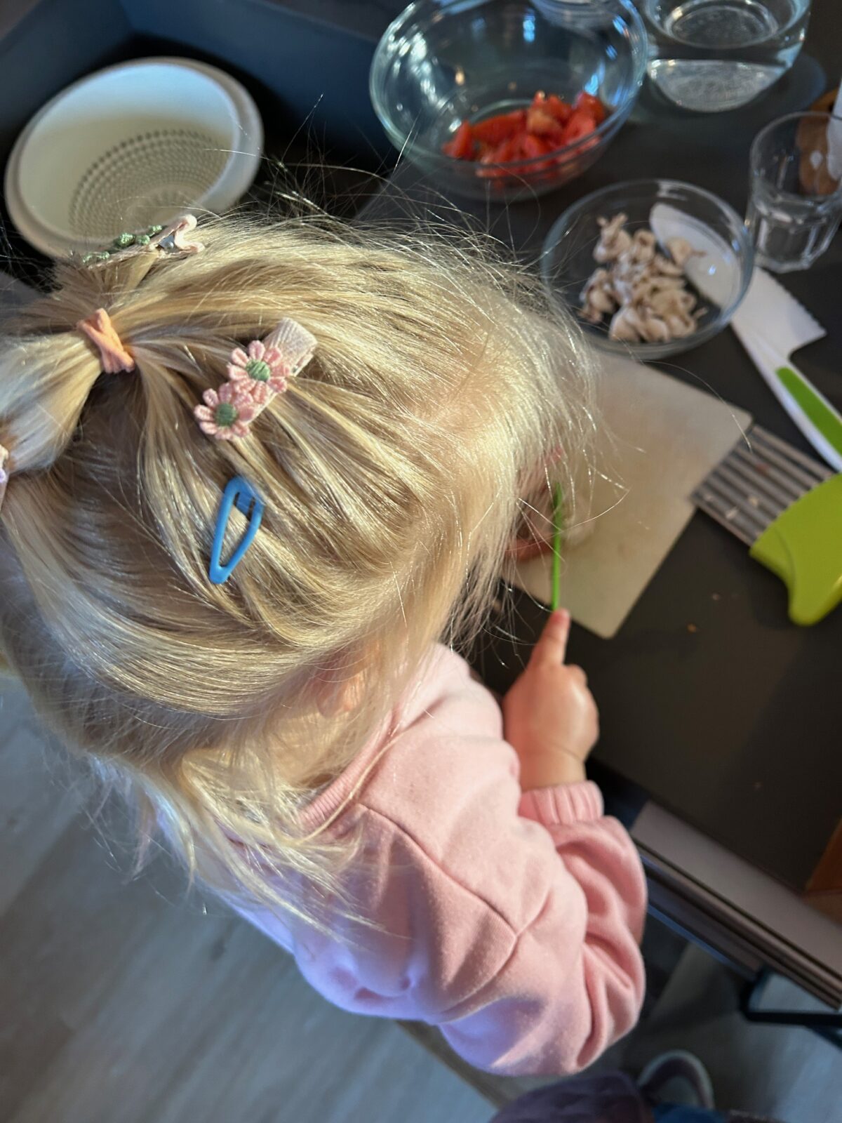 Bij mijn schoonouders thuis trof ik een hele ijverige Novae die extreem keurig champignons aan het snijden was. Mijn schoonmoeder had van die kindermessen gekocht en dat vond ze geweldig.