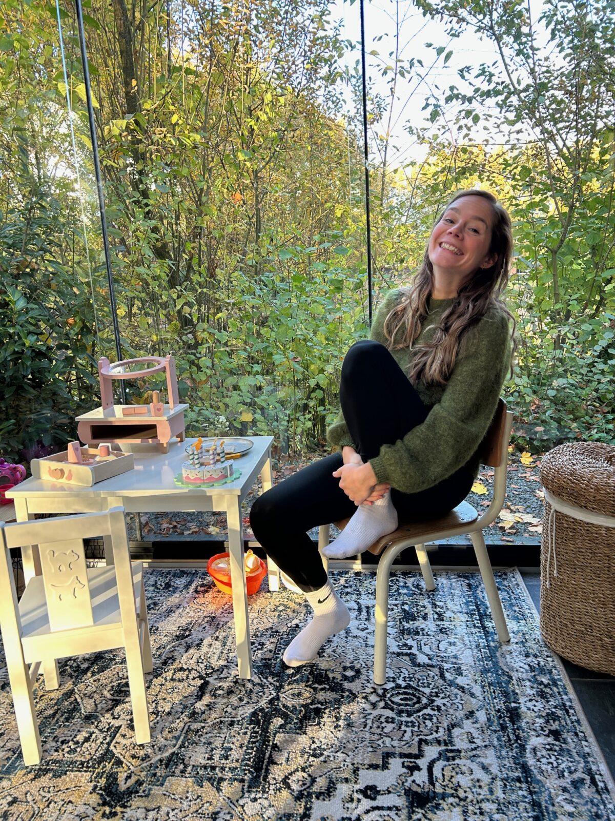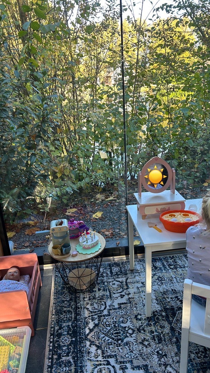 Vriendin Veertje kwam al eventjes langs toen we gesettled waren. Als we de deur naar de serre toe open laten staan, dan trekt de warmte van de kachel wel goed naar de serre ruimte toe gelukkig dus daar heb ik een leuk speelplekje gemaakt.