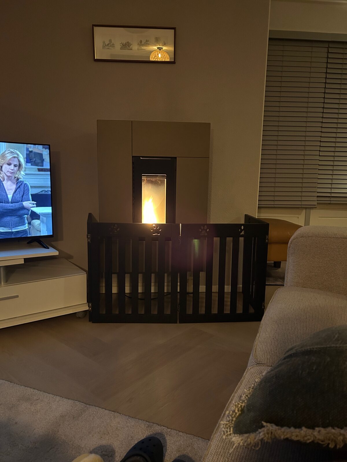 Deze kachel baarde ons vanaf het begin al een beetje zorgen. De bank kan niet echt anders staan en het raampje wordt toch erg warm. We regelden een hekje om de kachel. Novae is ook best een voorzichtig kind dus als wij uitleggen dat ze ergens niet aan mag komen omdat het pijn doet, dan doet ze dat eigenlijk ook niet.