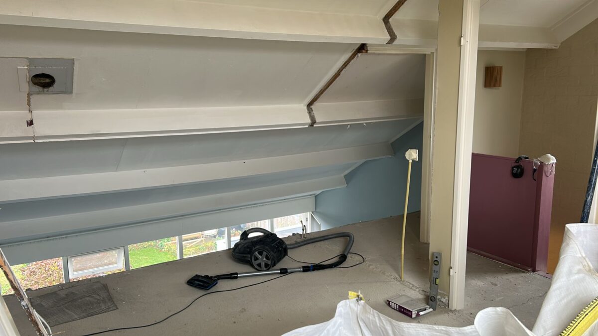De muur op zolder naar onze slaapkamer is eruit. Onze slaapkamer heeft nu de hoogte van twee verdiepingen (is mooi, maar kan praktischer), en we trekken de vloer van de zolder door zodat daar een extra kamer komt. Het is een beetje ingewikkeld om te begrijpen zo in tekst, maar dat is eigenlijk de bottom line.