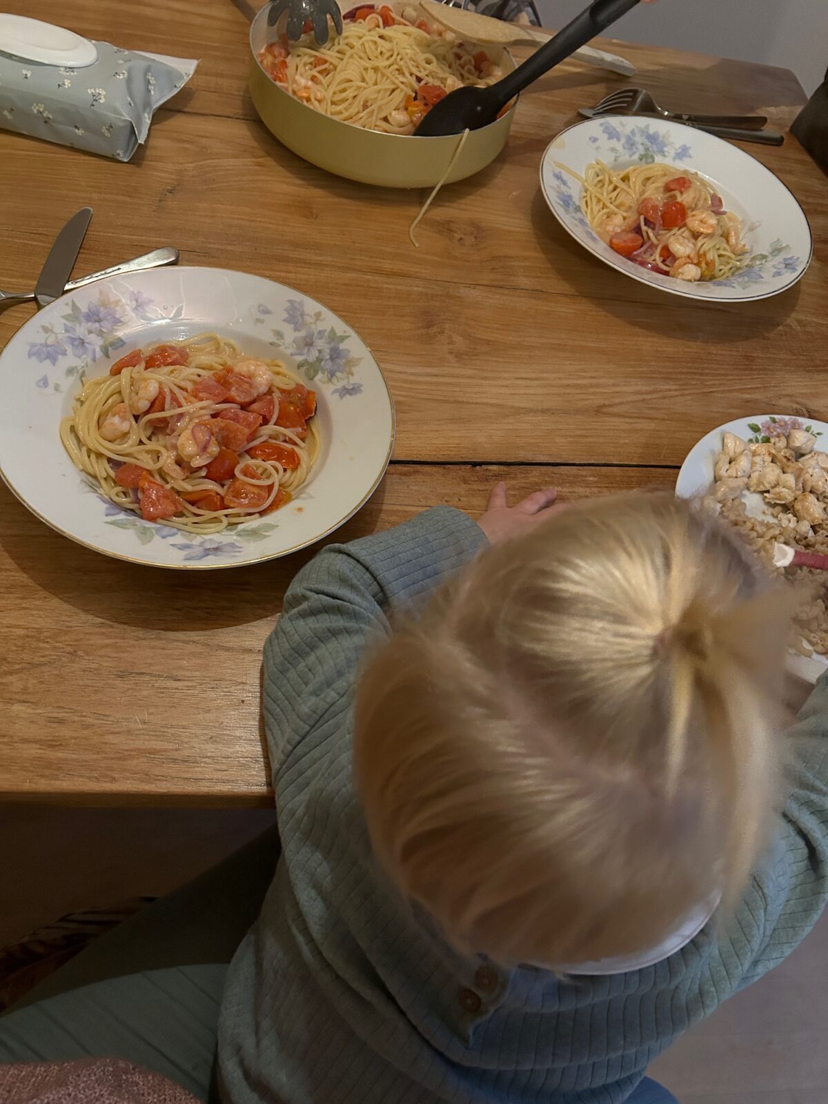 We kregen weer een Hello Fresh box binnen en we aten dus echt heel erg lekker! Deze pasta met knoflook-citroen garnalen was TOP. Ik zette deze foto ook op Instagram want je ziet vaak van die picture perfect HelloFresh foto’s voorbij komen, maar zo gaat dat bij ons thuis gewoon niet. Het is een praktische dienst en praktisch it is. Ik volg het recept en we knallen het lekker in borden om gelijk op te eten. Novae was nog steeds niet lekker dus die maakte gelijktijdig ook een kleine drama over in de kinderstoel eten. Dus, peuter op schoot en met 1 hand spaghetti eten. Als het je dan nóg lekker smaakt, dan is het gewoon een goed recept haha.