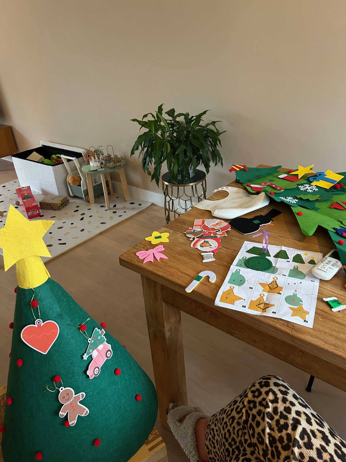 In het dutje ging ik aan de slag met een vilten Kerstboom van de Action. Ik had er eerst eentje online gekocht met klittenband, leek me super leuk voor Noof. Maar helaas vlogen die klittenbandjes er overal al vanaf en ik kon de hele bedoeling zo niet goed gebruiken. Deze van Action is dan ‘handiger’ en meer hufterproof haha. De grote Kerstboom slaan we toch maar even over dit jaar. Ik merk dat ik zelf ook gewoon geen zin heb om hem op te zetten. Ik ben ook geen giga Kerstdeco liefhebber eigenlijk. Ik heb inmiddels wel een holografische Kerstboom in het raam hangen en wat extra lampjes her en der. En een mini Kerstboompje op de eettafel, dat wel!
