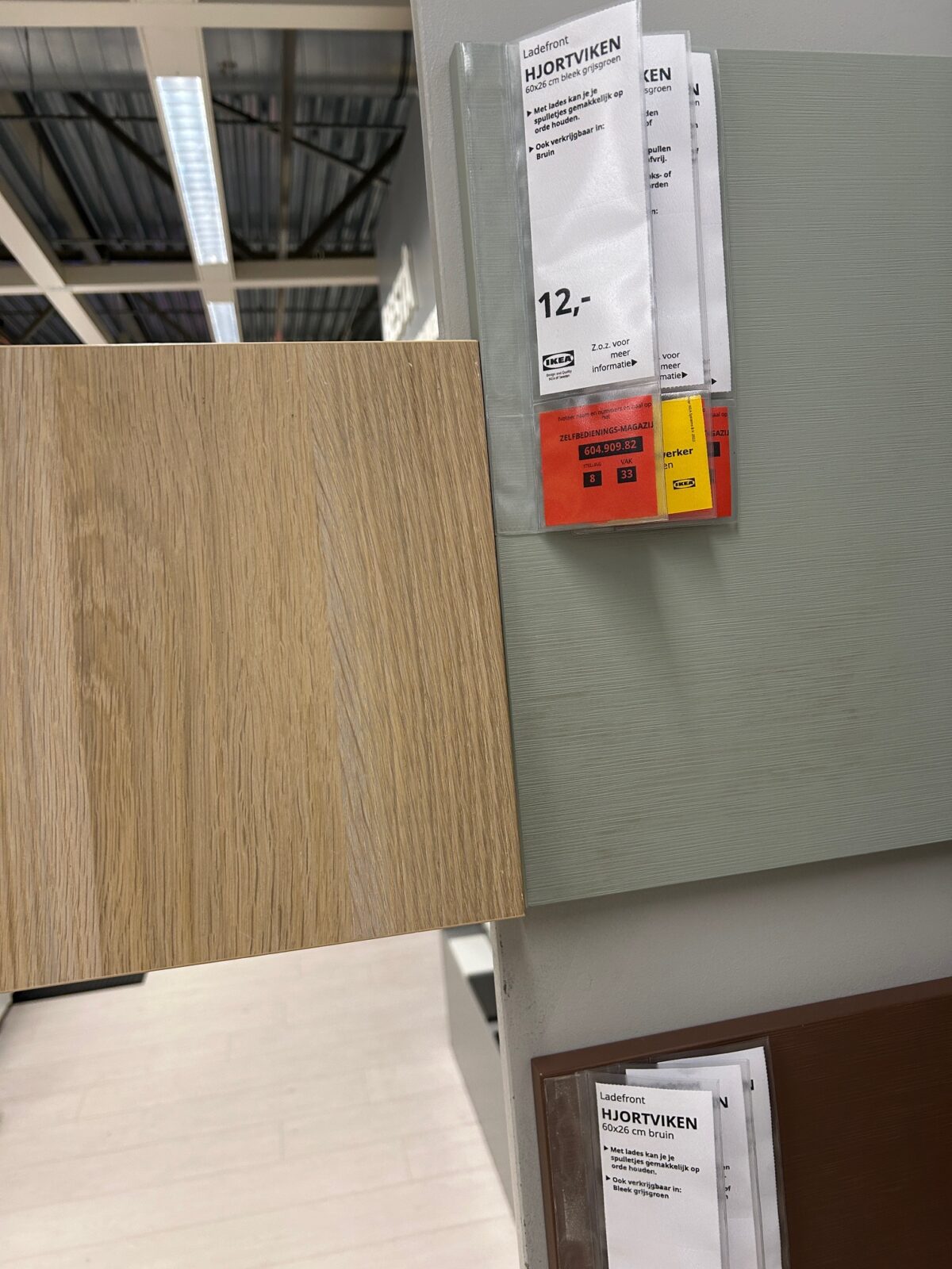 Voor onszelf worden het groene kastjes, en de binnenkant dan dit eikenfineer. Bovenop en aan de zijkanten komen dus tegeltjes, die moet ik nog uitzoeken. Eerst deze kast maar eens even kopen, dan een goede plank op maat laten maken en dan de tegels erbij zoeken.