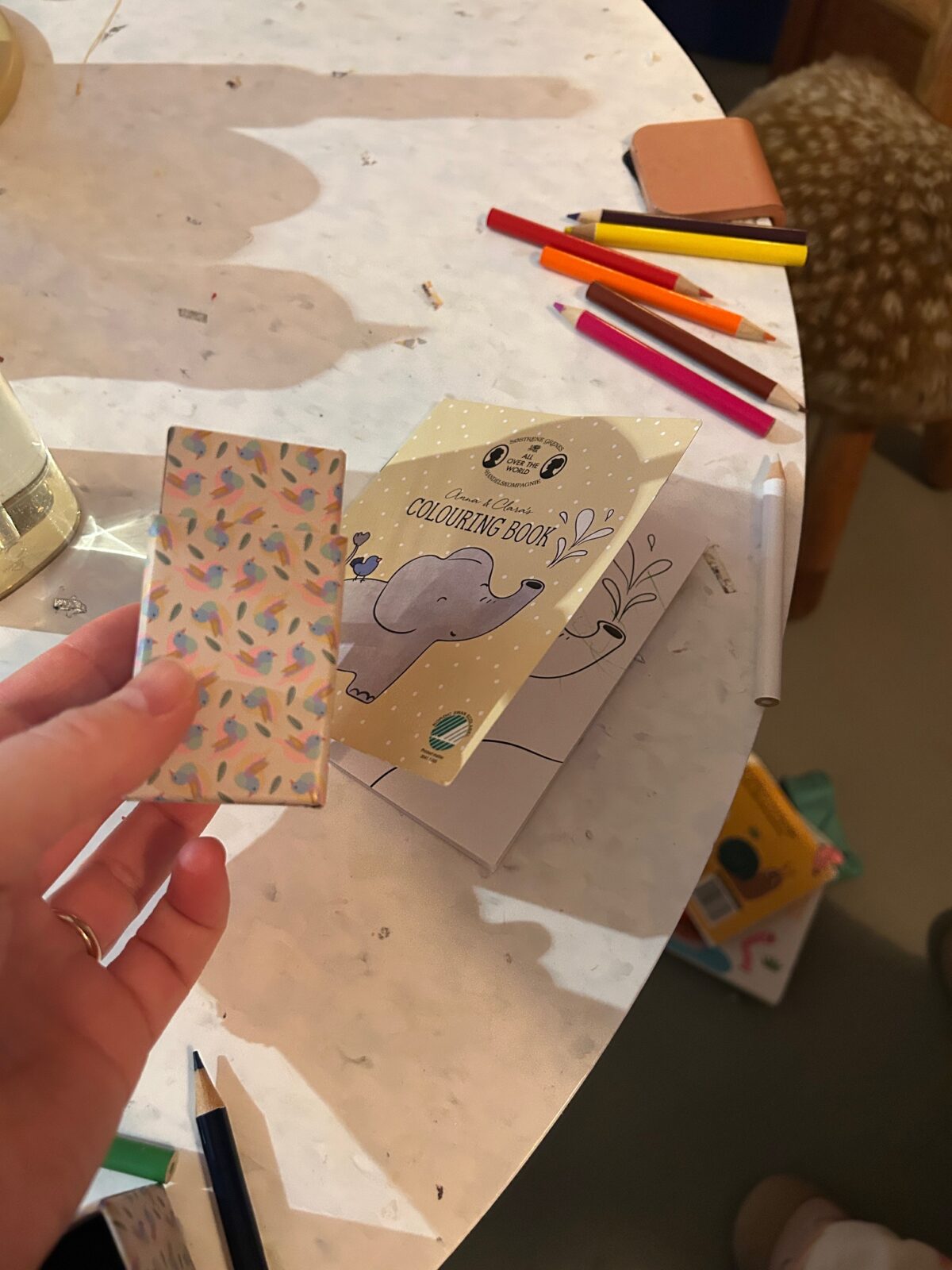 Ik kocht laatst dit kleine kleurboekje en zo’n klein containertje met kleurpotloodjes bij Sostrene Grene. Heel handig want het neemt geen ruimte in in de tas en je hebt wel altijd iets bij je om te spelen. Novae kleurt ook rustig de hele tafel mee dus daar moeten we alleen wel voor uitkijken haha.