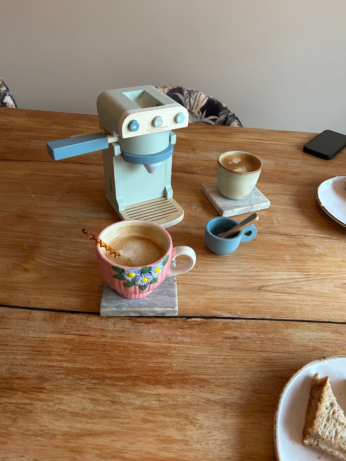 Het espressomachientje is van Little Dutch. Heel erg cute en ze speelt er ook echt elke dag mee nu. Ze vindt het heel leuk om koffie te maken voor iedereen en dan een taartje op een bordje te leggen. Heel schattig.