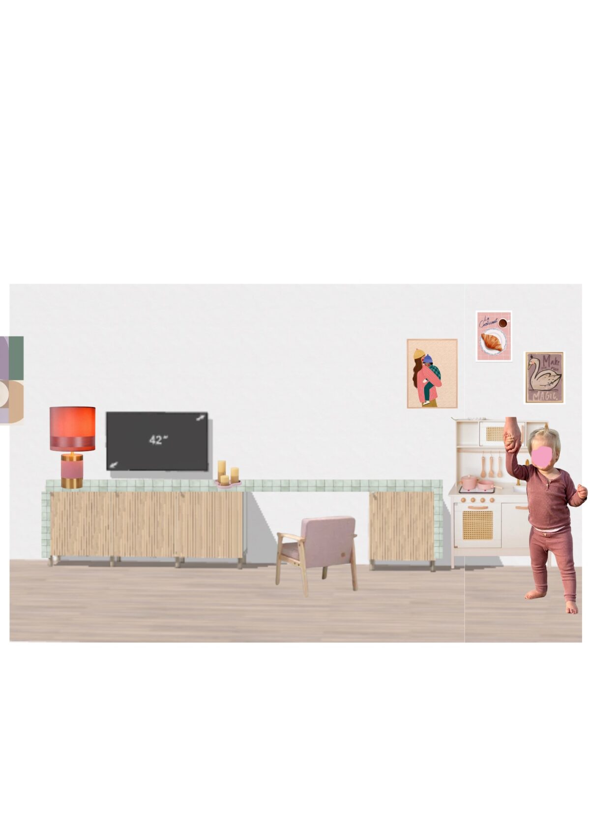 Het is niet helemaal hoe het wordt maar dit is een beetje het idee. We gaan met de Besta kast van Ikea een tv meubel maken, waar we een plank overheen leggen die dan doorloopt in een kinderzitje. De verhoudingen van dit voorbeeld kloppen niet helemaal en de kleuren ook niet. Uiteindelijk gaan we de zijkanten en de bovenkant helemaal betegelen, zoveel zin in! Heb dit zelfde idee (in verschillende uitvoeringen) ook voor een interieurplan uitgerold toevallig, twee keer in één week. Dat kan hier ook dacht ik!