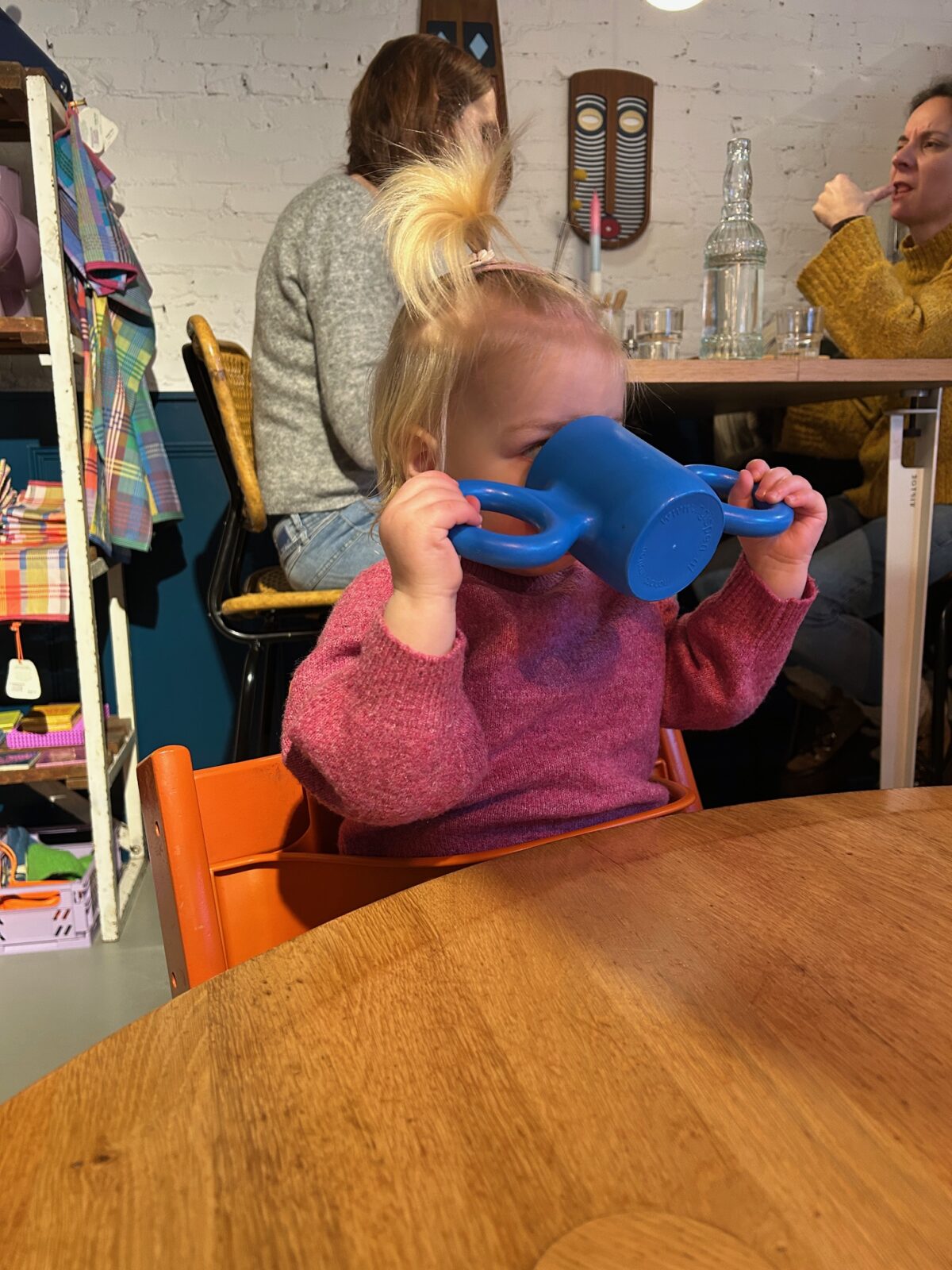 En bij Frank & Charlie kreeg ze een beker met giga handvaten haha, heel grappig!