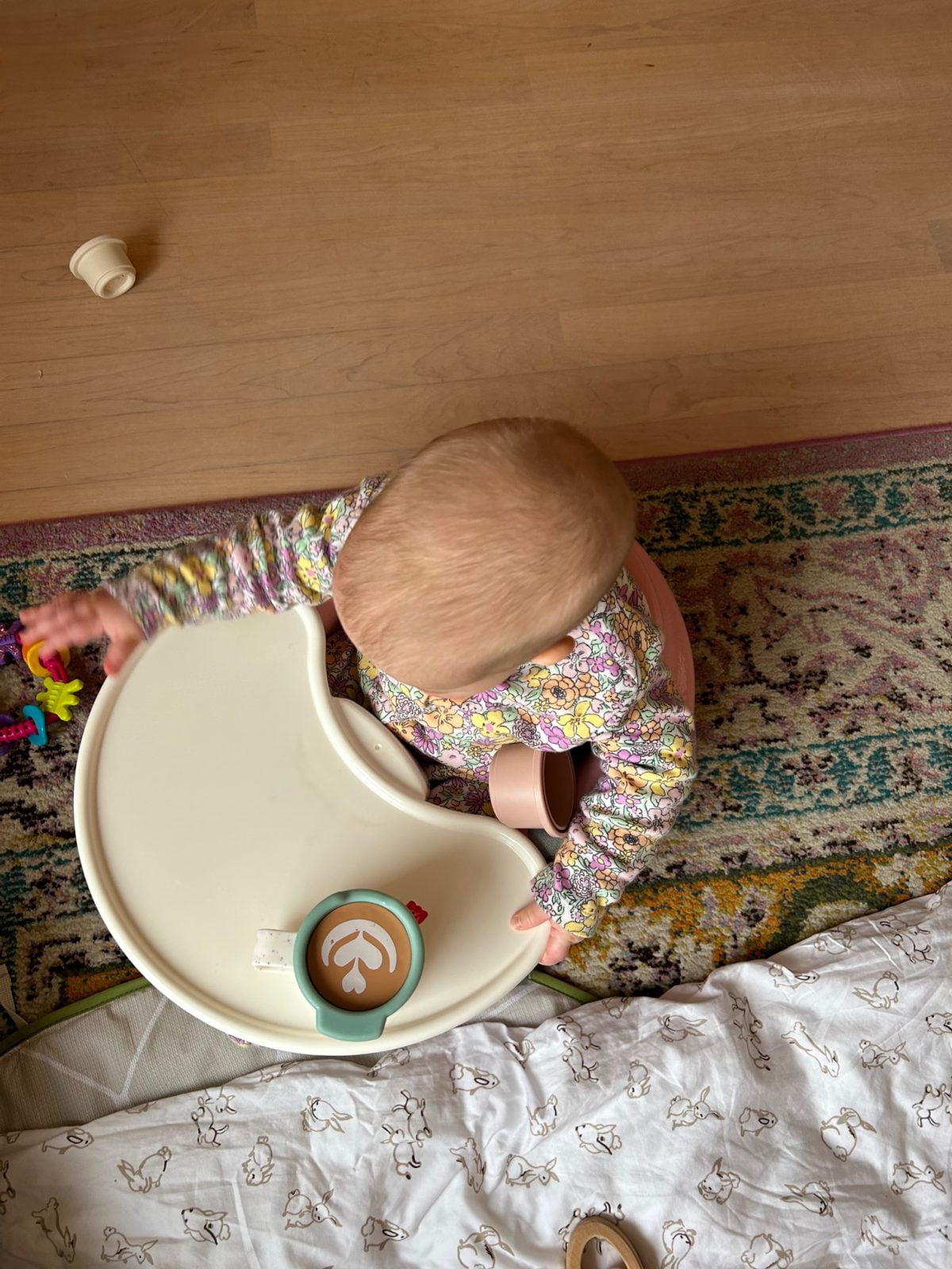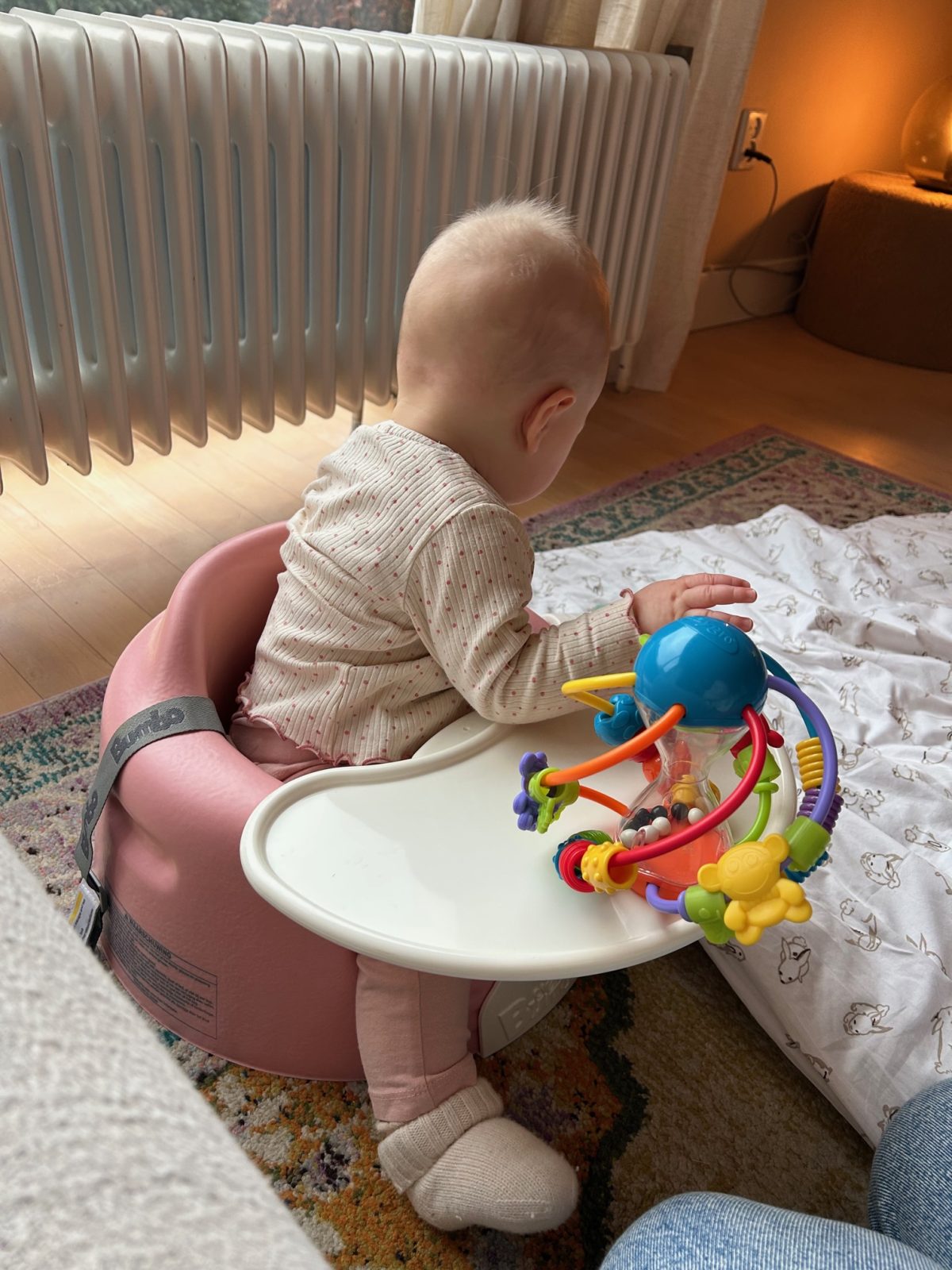 De bumbo stoel is favo hier nu. Deze kocht ik op Marktplaats onlangs, en doordat ze hier zo vast in zit kan ze hier wat beter zelfstandig in zitten. Wat ze zo los op de grond nog niet kan. Maar, ze wil uiteraard altijd alles wat ze nog nét niet kan dus dit stelt haar tevree haha.