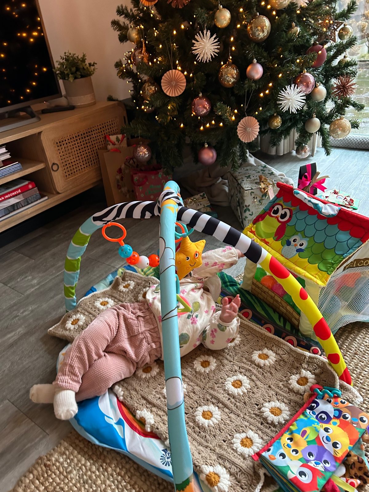 Op 24 december viert iedereen hier in Hengelo (en Enschede ook inmiddels) Kerstmiddag. Één van de populairste uitgaansmomenten van het jaar. Daar doe ik al een paar jaar niet meer aan mee en eigenlijk heb ik met vriendin Jen een beetje de traditie dat wij dan samen wat anders leuks gaan doen. Dit jaar hebben we beide een baby dus het werd een koffie date bij Jen thuis. Novae kon zo onder de babygym van haar vriendje Miles.