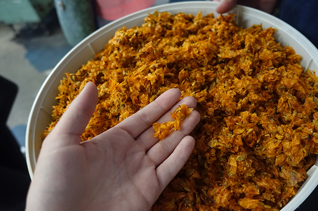 En alles wordt gebruikt! Dit zijn de vliesjes en pitjes van duindoornbessen, deze worden verwerkt in cosmetica van Weleda.