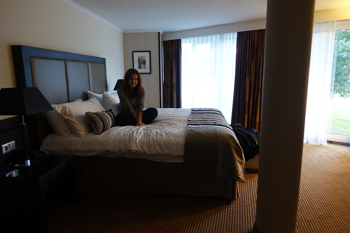 Na een uurtje rijden zijn we in Beetsterzwaag, we worden heel hartelijk ontvangen bij Bilderberg Landgoed Lauswolt. En onze kamer is echt bizar! Ik denk dat dit de grootste kamer is waar ik ooit in geslapen heb, ik denk dat ons vorige appartement kleiner was… Dit is de zithoek.