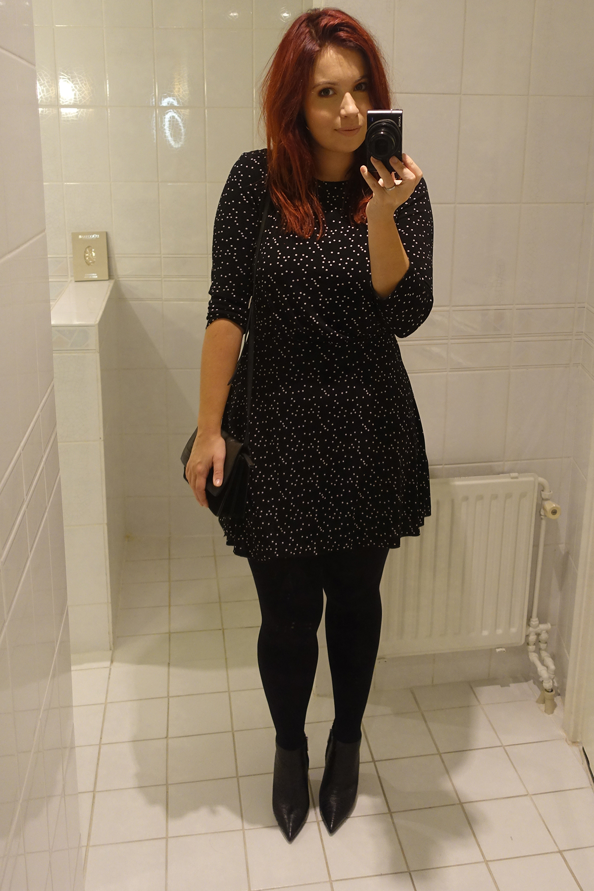 Ik heb me omgekleed. Ik draag een jurkje van Mango en enkellaarsjes van Aldo.