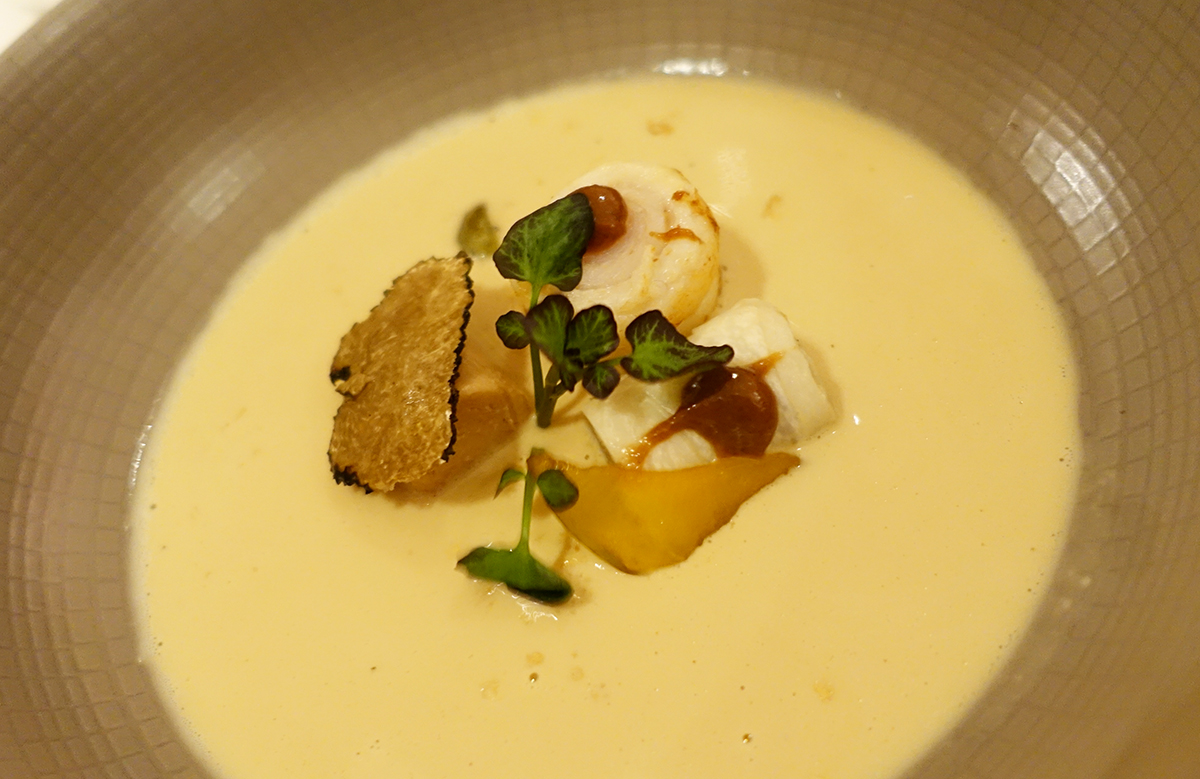 De tweede gang is van Tonny Berentsen van De Kromme Dissel. Het is een creme soep van eekhoorntjesbrood met sliptong, ganzenlever en paddenstoelen. Deze is wáánzinnig lekker: een explosie van smaak. Nu ben ik al echt dol op paddenstoelen, maar dit smaakt zo intens met de truffel en ganzenlever, echt fantastisch.