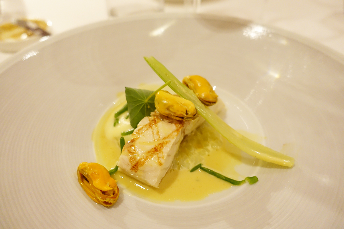 Dit is gegrilde wilde zeebaars en Zeeuwse mosselen met venkel, luchtige aardappel en mosseljus van Richard de Vries van The Park. De zeebaars is superzacht van textuur en smaak en de knapperige frisse venkel smaakt daar goed bij. De mosselen zijn supermals, echt lekker.