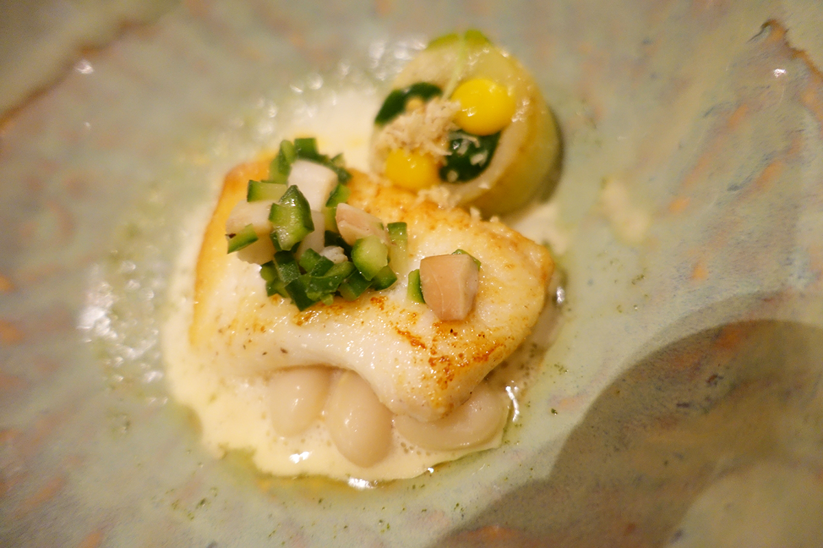 We beginnen met het gerecht van Wessel van Ruijmgaart van de Kersentuin. Je ziet zacht gegaarde kabeljauw met gerookte paling, kombu en sereh. Het is een heel fris en licht gerechtje dat bijna eet als een salade door alle kleine knapperige garnituren erbij.
