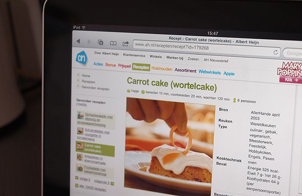 Als ik een recept kook dat ik van internet heb, zet ik altijd mijn iPad op mijn aanrecht om zo het recept te lezen. Handig! Wel uitkijken dat er geen beslag of eieren overheen gaan. Het recept dat ik heb gebruikt van de Allerhande.