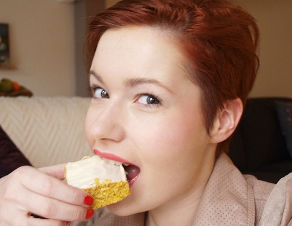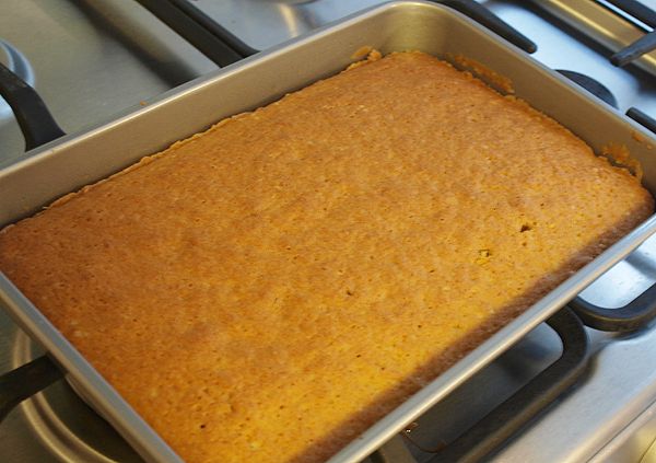 En na 45 minuten haal je de cake uit de oven. Zo ziet ‘ie er dan uit, lichtelijk oranje! Laat dit even goed afkoelen voor je de frosting er over doet.
