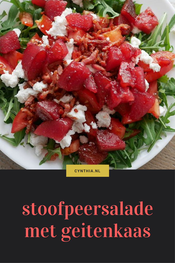 - Verdeel de rucola over twee borden, verdeel de gebakken stoofpeertjes erover met de blokjes tomaat en de spekjes. Verkruimel de geitenkaas hierboven.