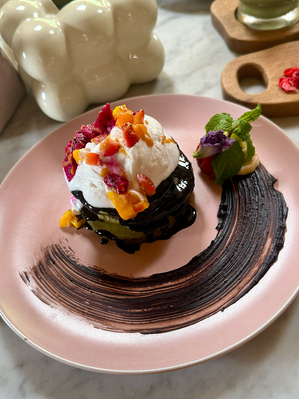 De dag erna brunchen we met Rubeen en Niko na een yogales bij Murdra, waar ik deze waanzinnige matcha pancakes eet.