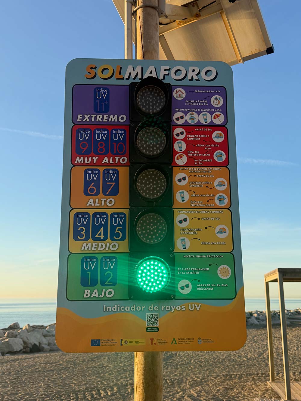 Zo goed, op het strand staan hier UV-index stoplichten. Zo kan je goed zien hoe sterk de zon is en welke maatregelen je moet treffen.