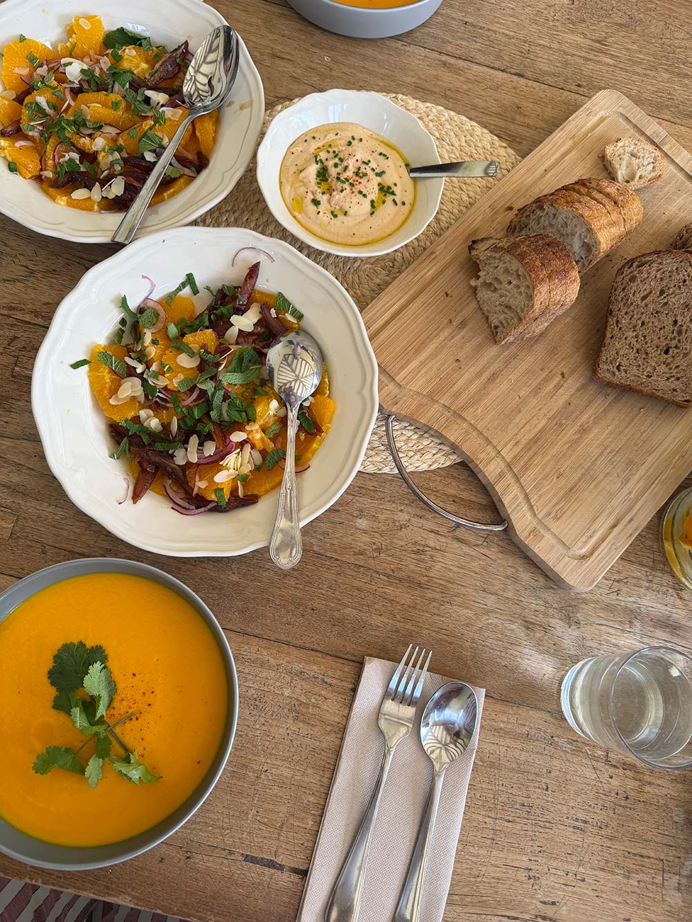Wortel-kokossoep met een sinaasappelsalade, en brood met bonenhummus.